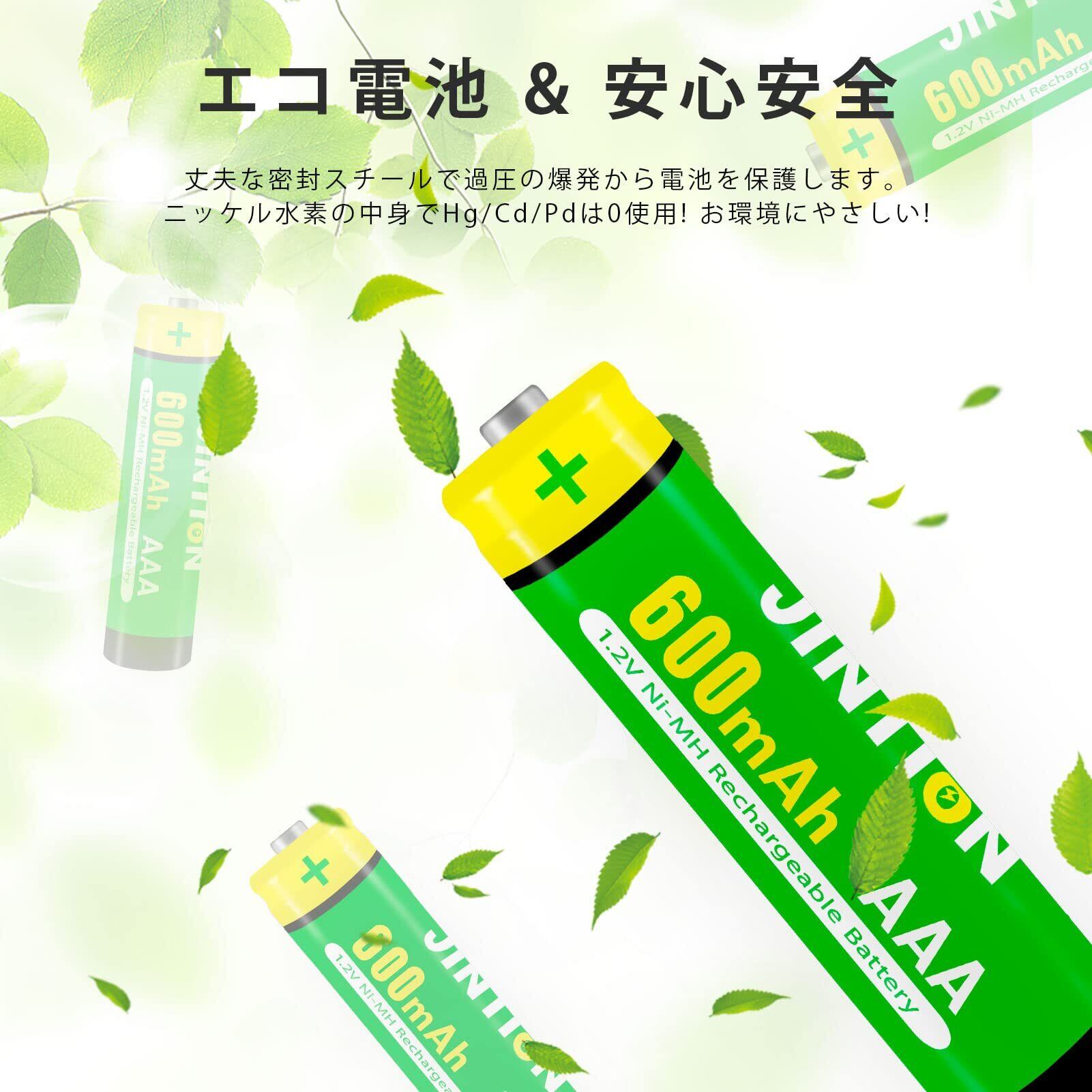 適格容量:JINTION単4形充電池充電式ニッケル水素電池。厳密な容量テスト、実際のバッテリー容量は600mAhです、長時間使用できます。電圧は1.2 Vで、非常に安定しており。ほとんどの1.2vバッテリー充電器と互換性のある単3充電式バッテリー。