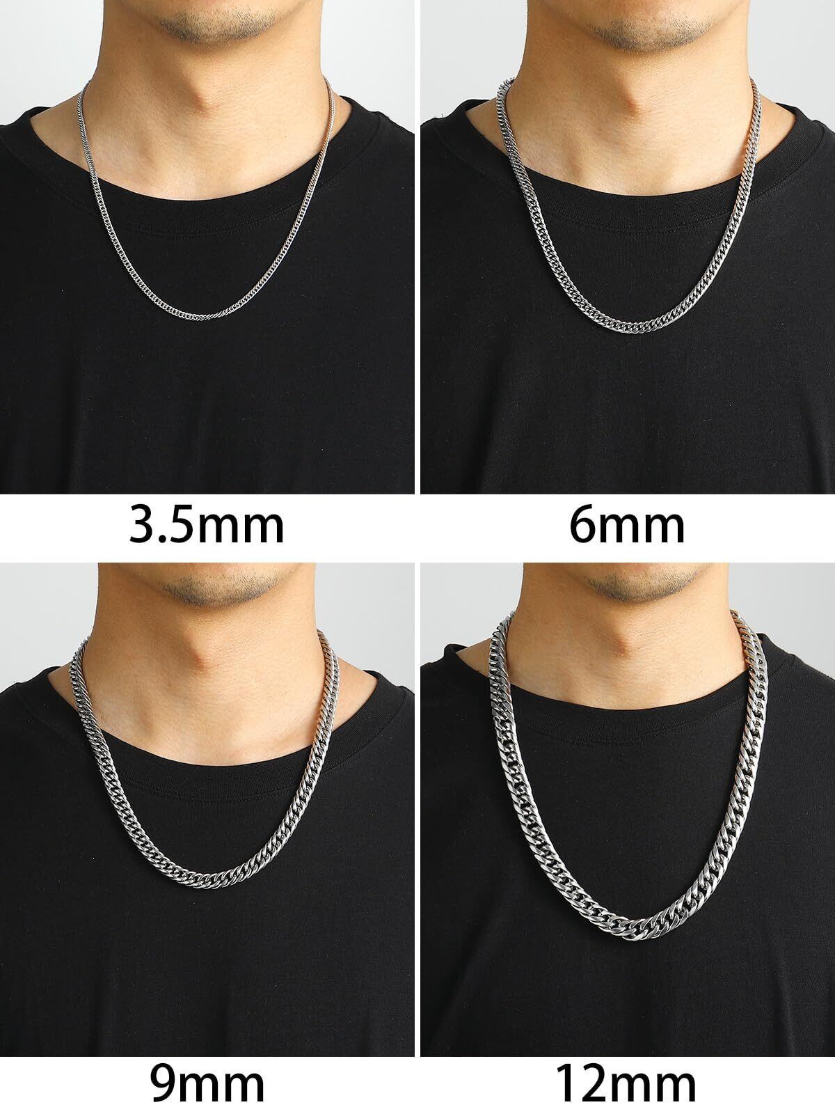 【色も!太さも!長さも選べる!】3.5mm、6mm、9mm、12mmの4太さ、シルバー、ゴールド、ブラックの3色、46cm、51cm、56cm、61cm、66cm、71cm、76cm、91cmの8長さ、全72種類を揃えました!