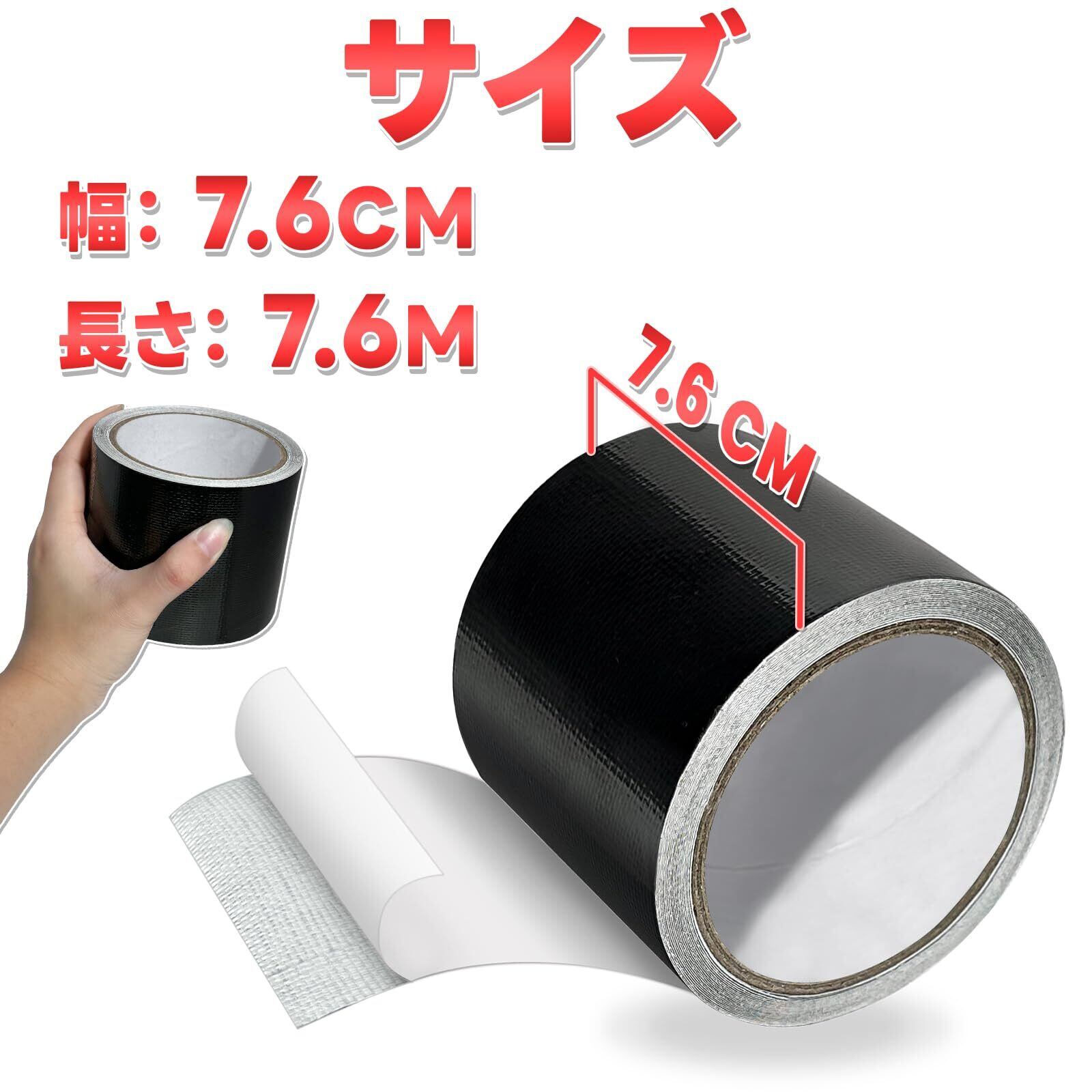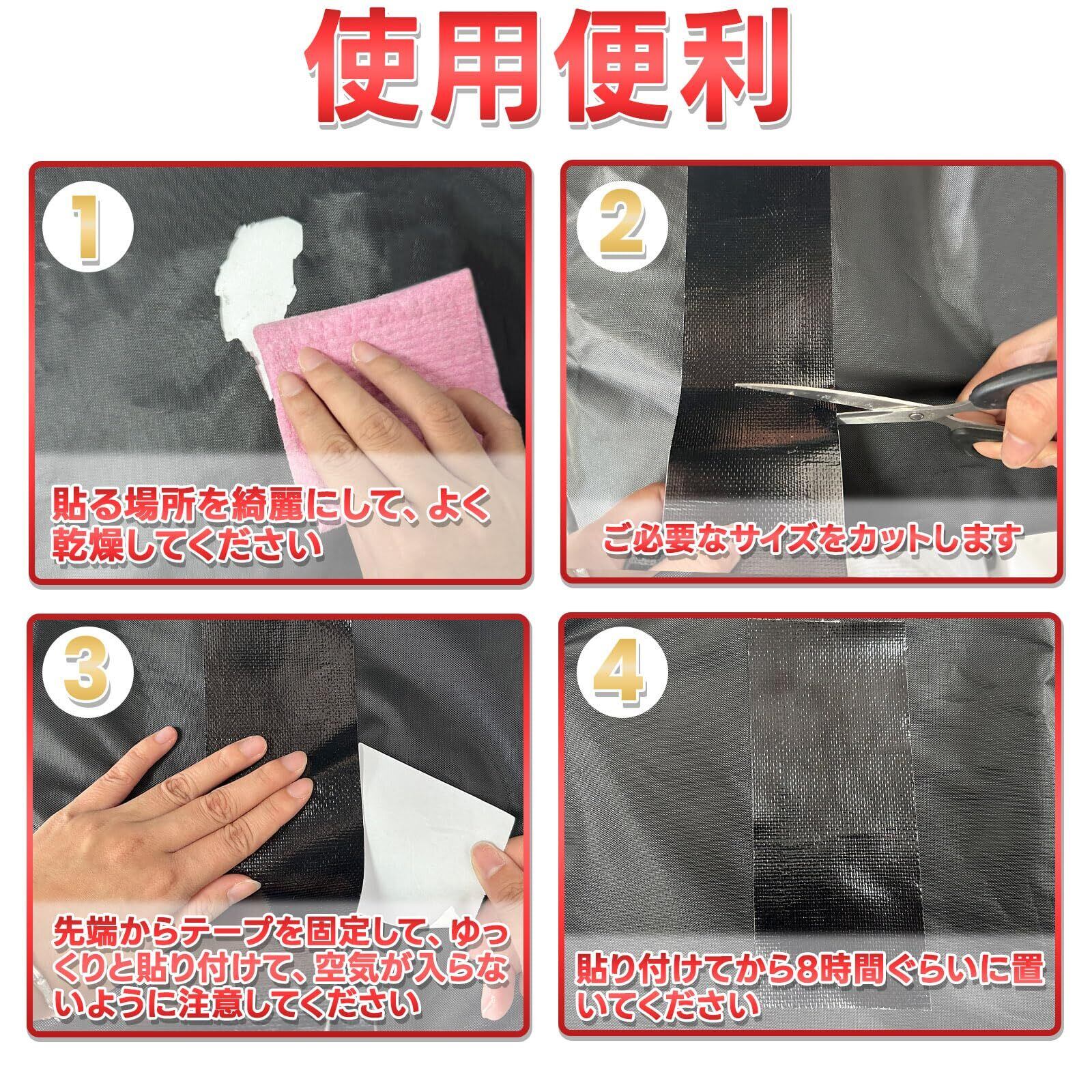 【自由にカット&使用便利】 車のカバー補修テープは超強力です、今まで補修テープの接着力に不満の方は是非お試しください。そのほか、防水効果が抜群で、水や雨に当たっても全然大丈夫で、テント、タープ、パラソル、傘など屋外に使用でも補修効果が抜群です、雨の天気は全然大丈夫です。屋内はもちろん、屋外でもその粘着効果を存分に発揮します、幅は7.6cmで、修繕したい個所のサイズによって自由に調整可能です。