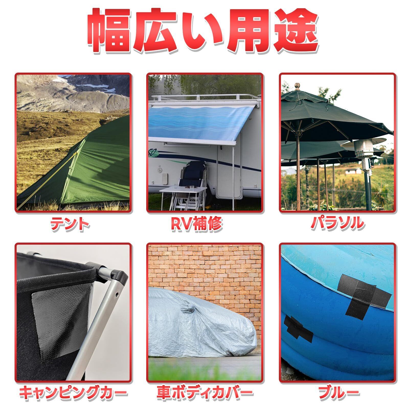 【強力な粘着力で色んな場所で使える 】万能な補修テープは様々な素材に使用することができ、織物の破損にしっかり補修でき、日よけたな、タープ補修、パラソル、ナイロン、キャンバス、人工皮革、各種プラスチックさまざまな素材に修理できます。窓、アウトドア用品、浴槽またはタイルなどの仮補修などです。この強力補修テープが持つ、大抵の物は補修ができて、持っていれば大変心強いアイテムです。