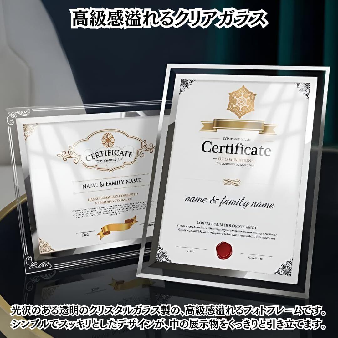 【高級感溢れるクリアガラス製】光沢のある透明のクリスタルガラスが特徴的な、高級感溢れるフォトフレームです。シンプルでスッキリとしたデザインが、中の賞状や写真をくっきりと引き立てます。縁にあるシルバーのラインがアクセントとなり、より美麗さを演出してくれます。インテリアとしてもおすすめの美しさ溢れる一品です。