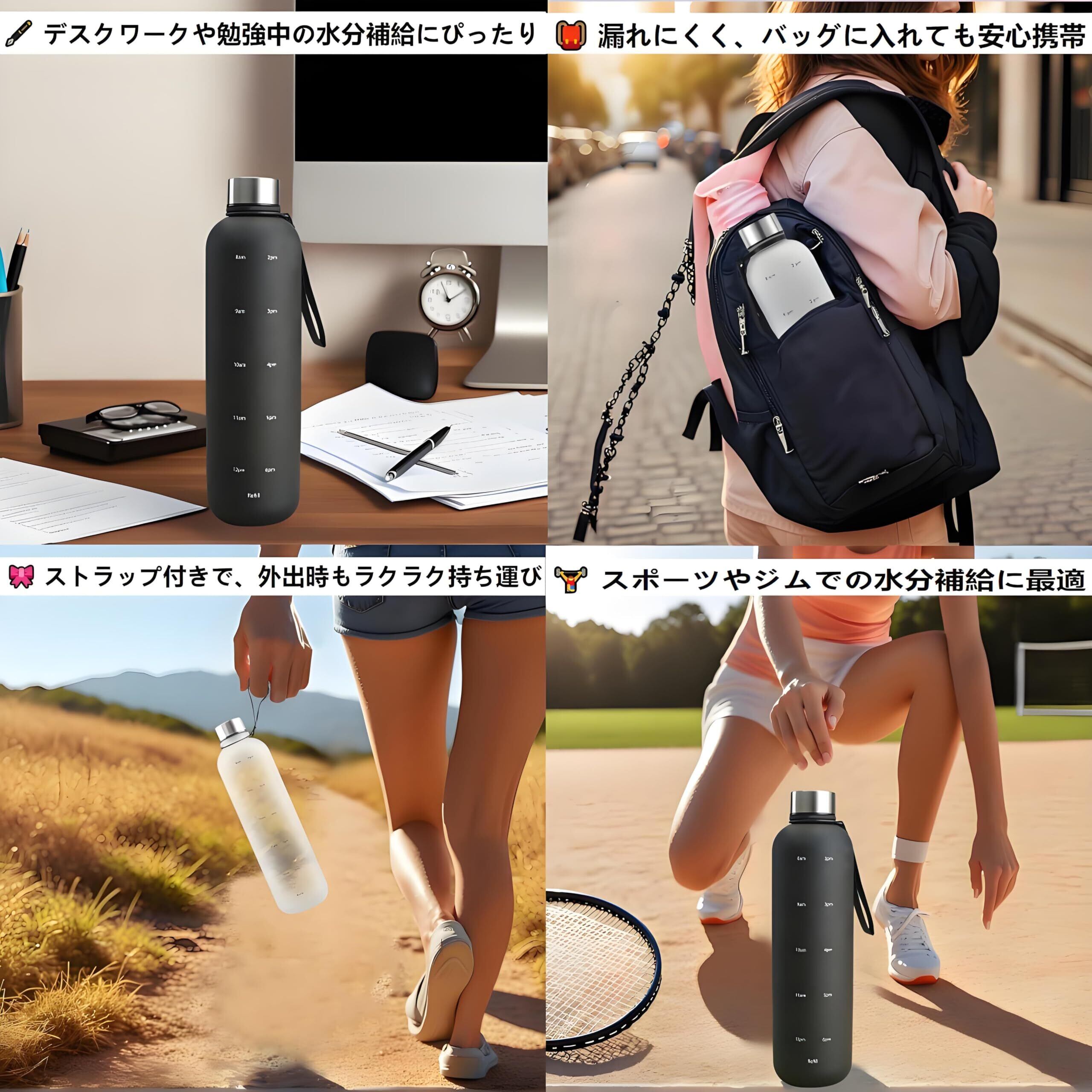 3. 取っ手付き ドリンクボトル: キャリーストラップ付きのデザインは、毎日の通勤にとても便利で、持ち運びも簡単です。アウトドア旅行、ジム、ランニング、ヨガ、学校、オフィス、音楽祭、運転などに最適です。どこに行っても持ち歩いて、水分と健康を保つのに役立ちます。
