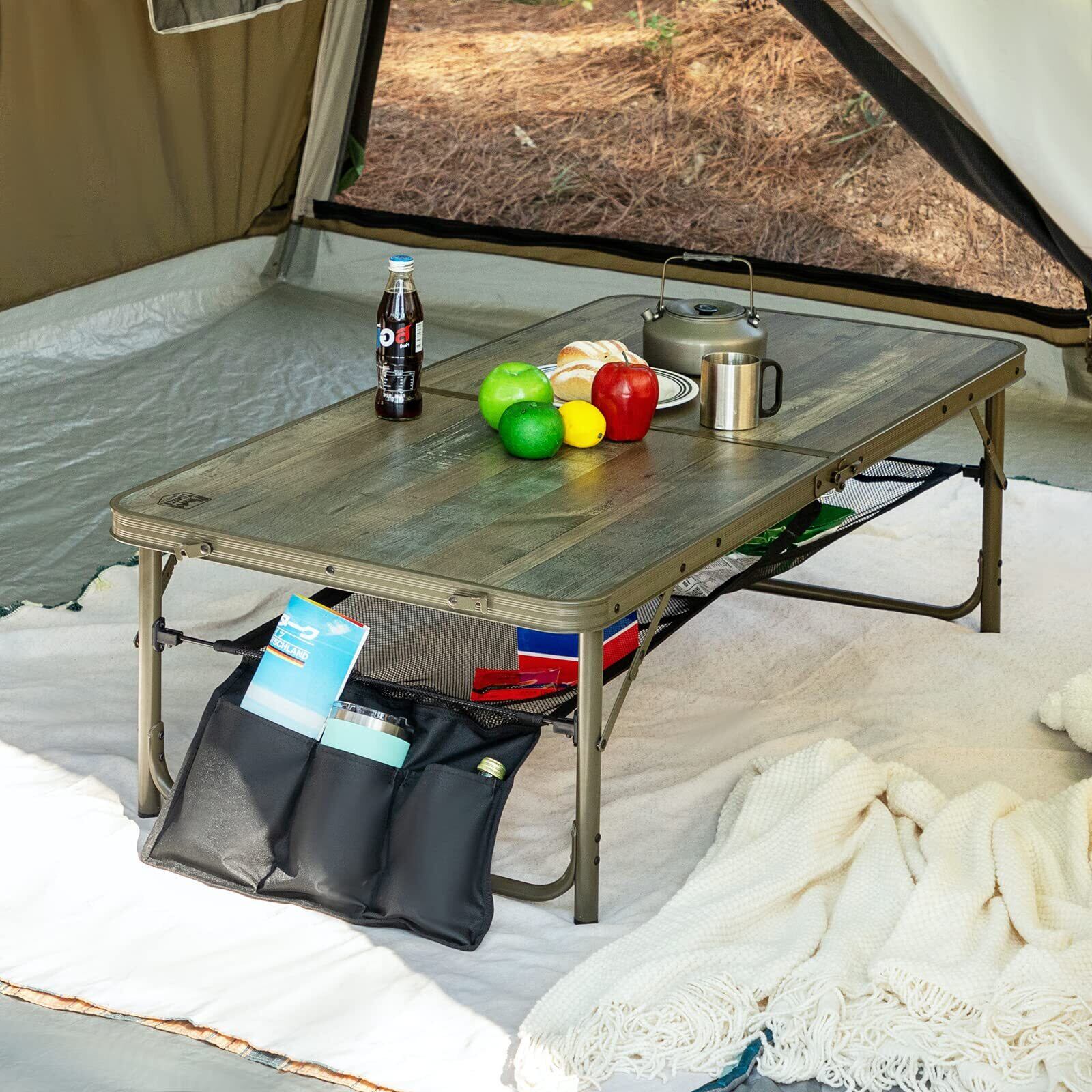 【取り外せる雑物収納ナイロンメッシュ付き】:フォールディングテーブルの天板の下には、収納ナイロンメッシュ付き、多くの雑物を収納できます。 不要になった場合はすばやく取り外すことができます。