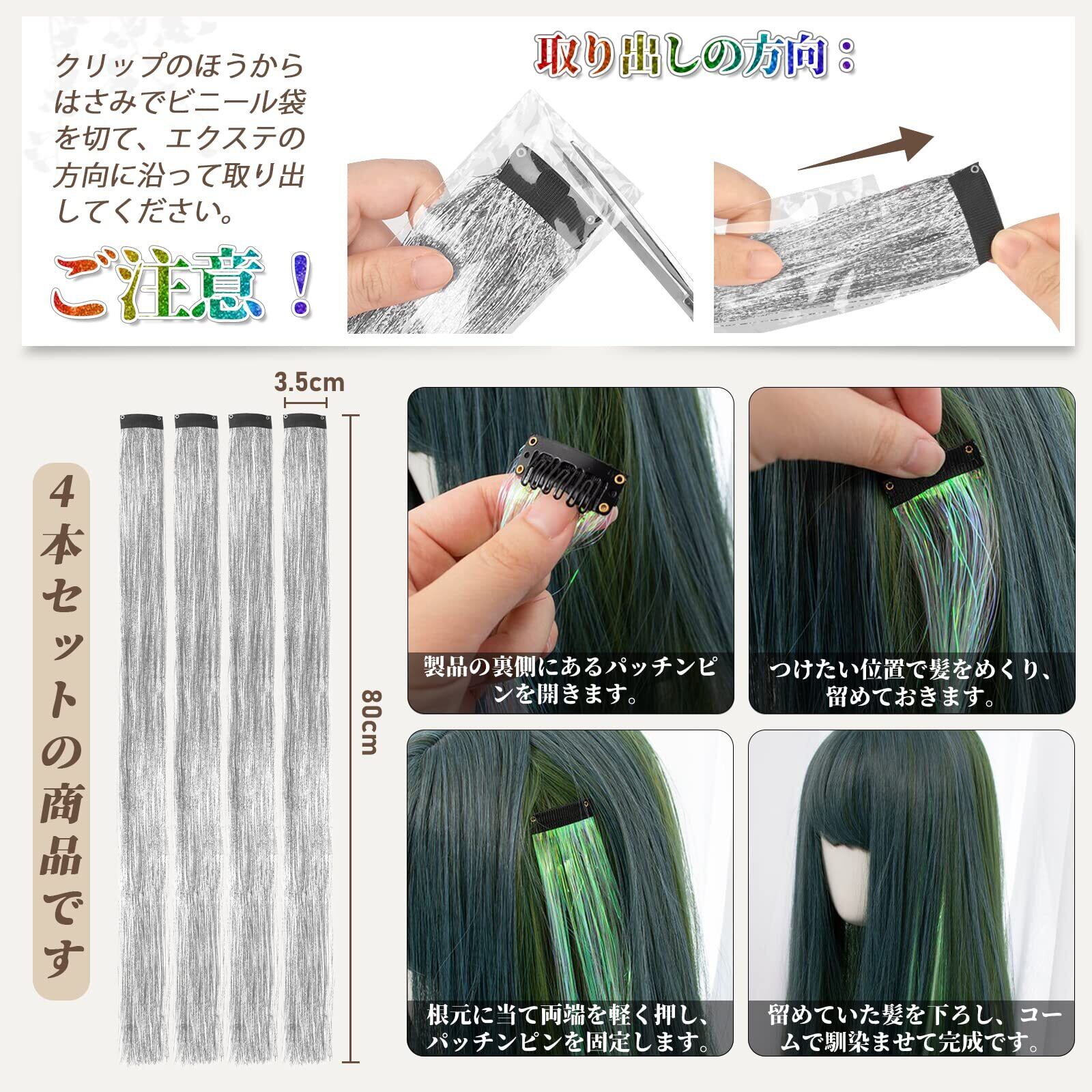 BARSDAR ヘアティンセル カラーエクステ エクステ ストレート 髪飾り キラキラ ヘアエクステ カラフル 輝く ウィッグ ティンセル エクステ オシャレ ハロウィン 祭り コスプレ パーティー 舞台用 4本セット クリップ式 (グリーン)