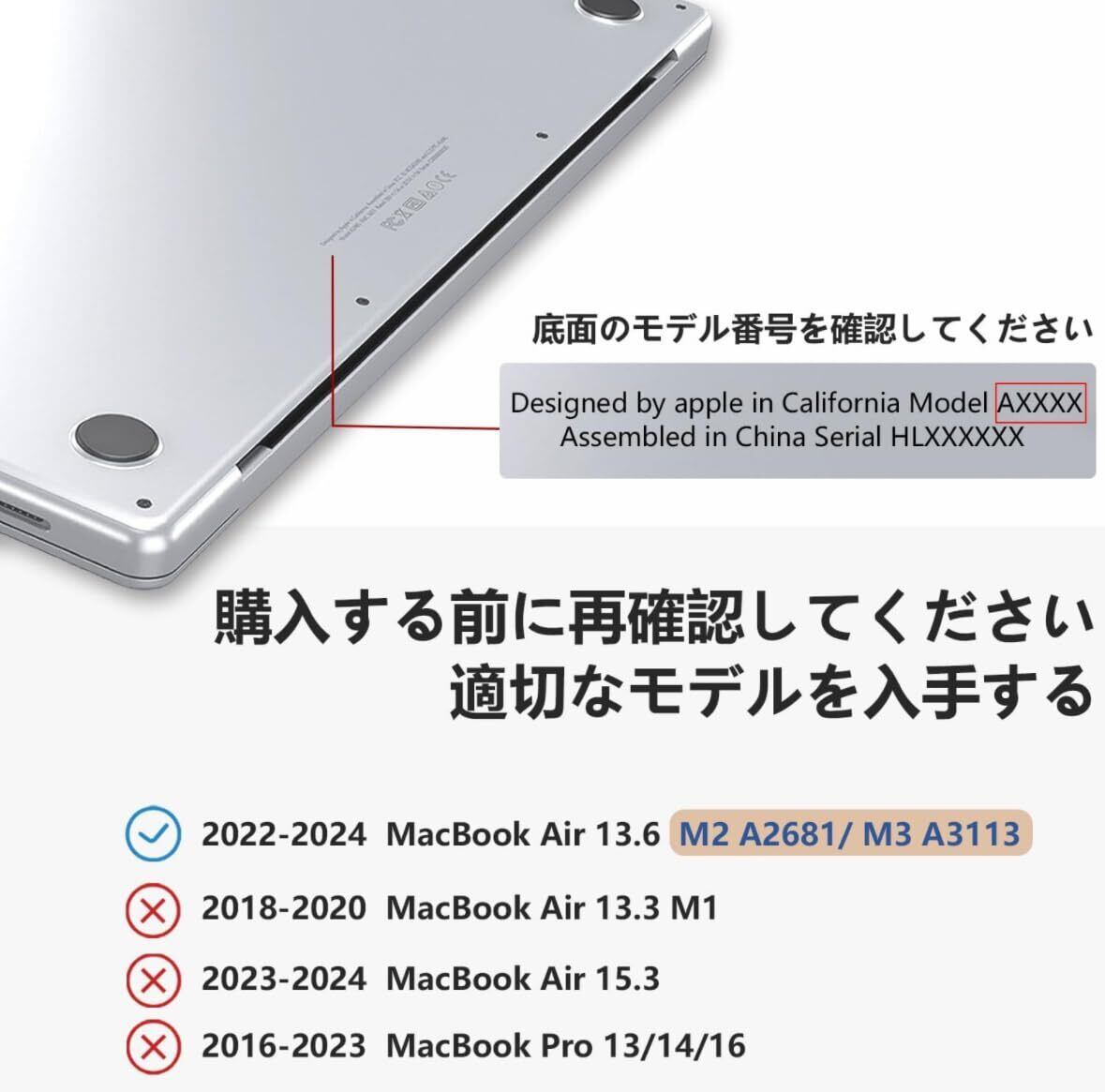 【対応機種】 Macbook 13.6 Air M4(A3240 /2025年3月発売モデル)/M3( A3113 2024年3月発売モデル)/M2 ( A2681 ) 対応 ※モデル番号はマックブック底面のAから始まるモデル番号をご確認下さい。 MacBook Air M2/M3用ケースAir 13.6inch M4/M3/M2 (A3240/A3113/A2681)