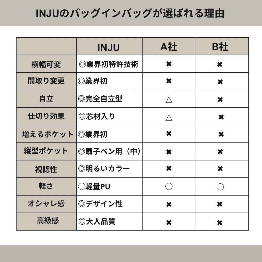 【数量限定】INJU 横幅可変式バッグインバッグ【雑誌掲載全5色 1個で3サイズ 唯一無二の横幅調節】 舟型スクエア両用タイプ 完全自立型 マチ幅10cm 軽量 特許機能 大きさ調節可能 スナップボタン調節 3in1 メッシュ増える4ポケット シュリンク型押し 高級PUレザー バッグインバッグ インナーバッグ オーガナイザー バックインバック