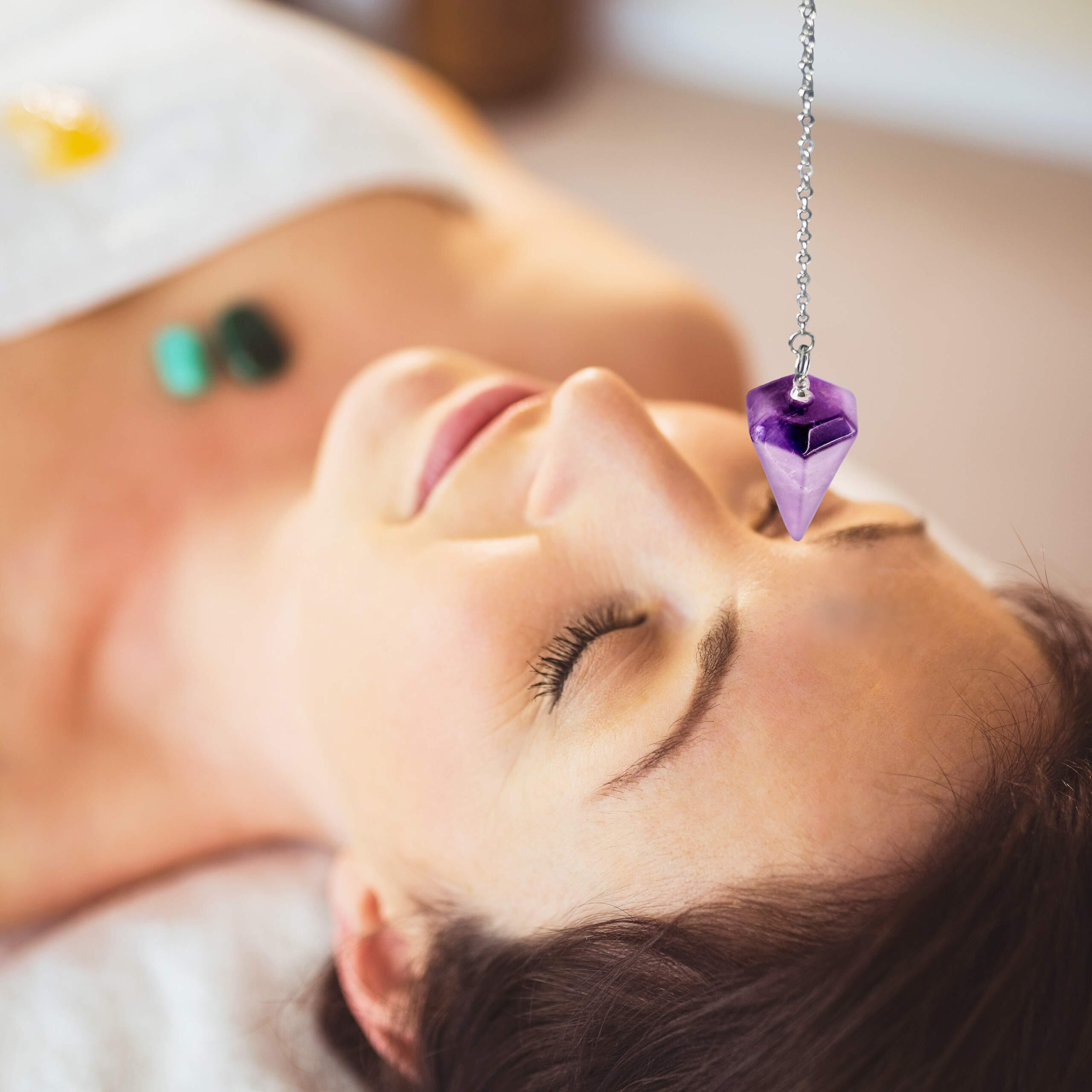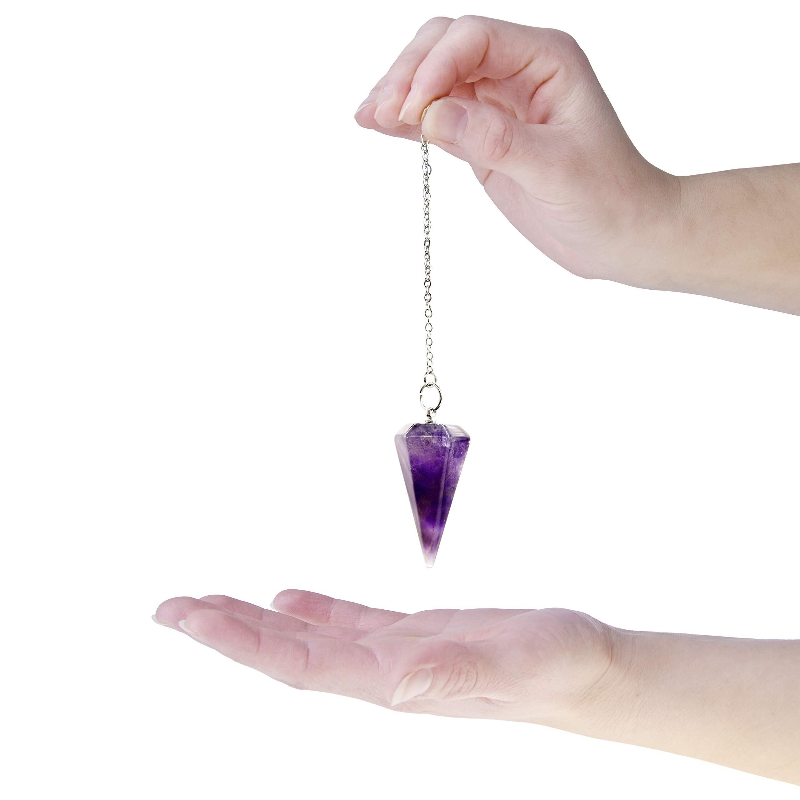 【数量限定】天然石パワーストーン ペンデュラム振り子、 ダウジング風水占い用、 天然紫色アメジスト(紫水晶)製、ヒーリングストーン チャウラストーン六角錐 6面カット、金属チェーン付き