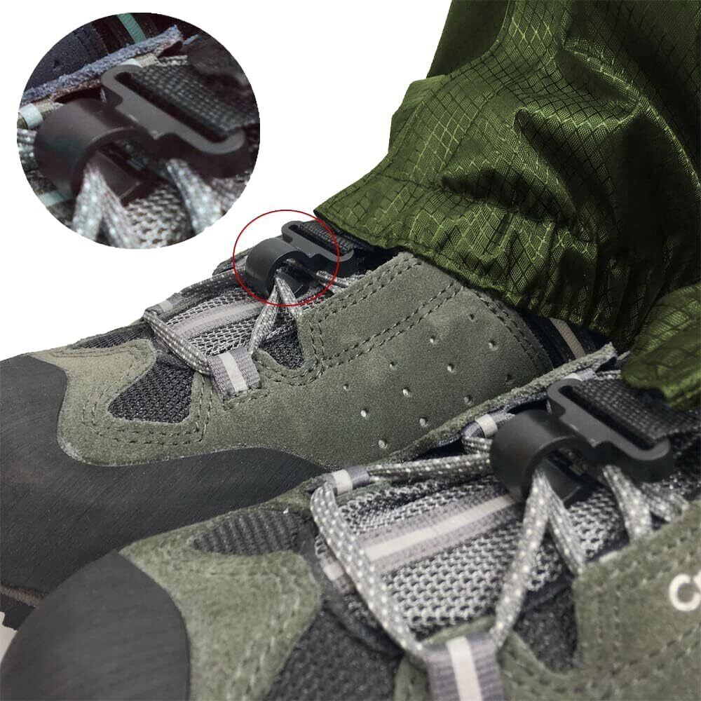 【伸縮性】:ゲイター下部のフックは靴紐に引っ掛けます。ストラップはシューズ底のアーチ部分を通します。バックル部分で長さ調節でき、伸縮性がありますので、しっかりフィットします。