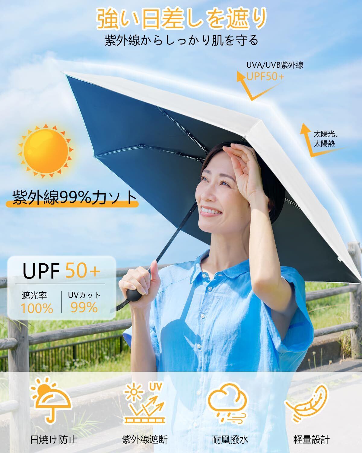 ?「晴雨兼用&携帯便利&360日常備傘」この折りたたみ日傘は非常に軽量で、重量はわずか240グラムです。コンパクトで携帯に便利で、専用の収納袋が付属しており、バッグに簡単に入れることができます。車に常備するのも問題ありません。また、日傘としてだけでなく、梅雨シーズンにも欠かせない優れたアイテムです!一年中使用できます。