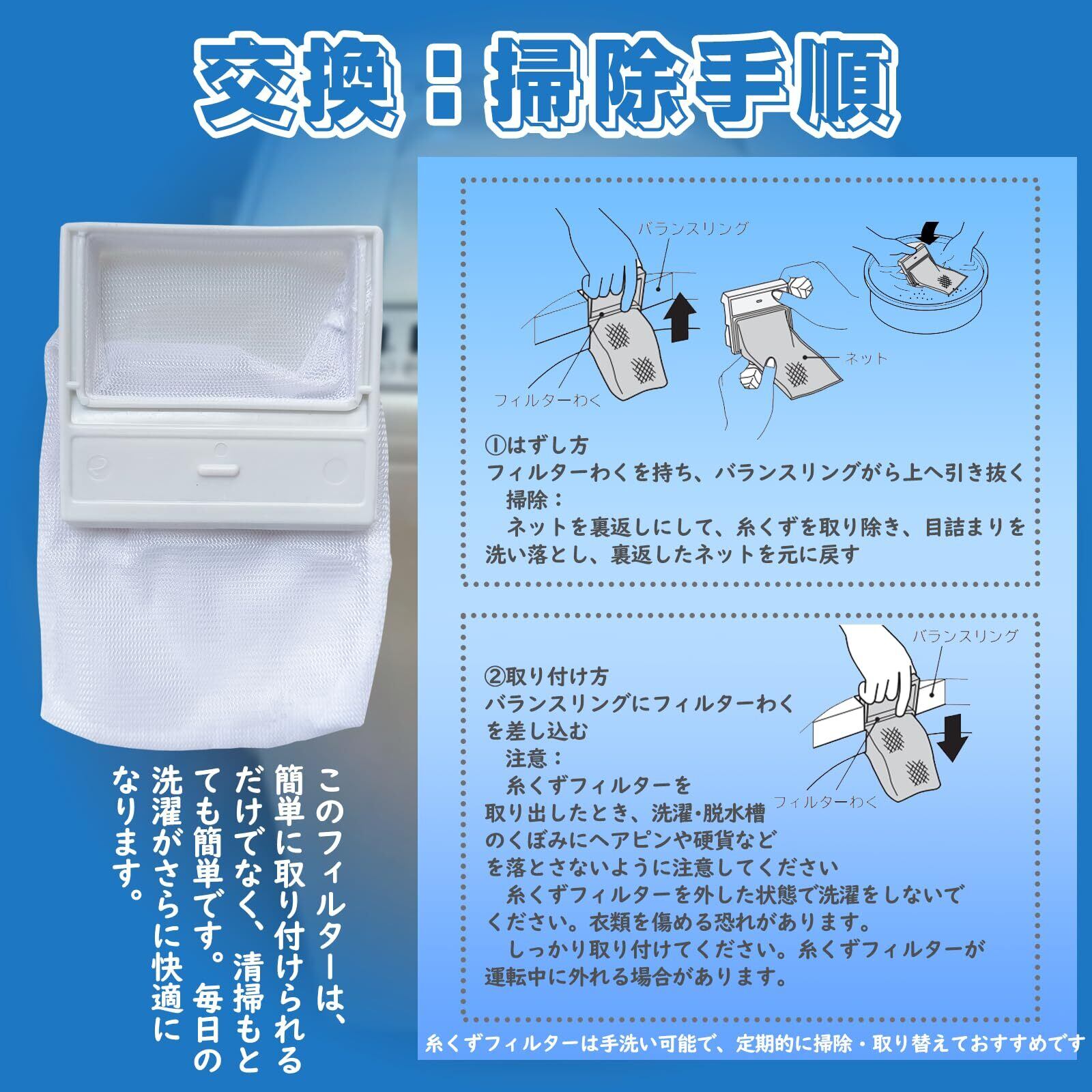 【掃除 ・ 交換手順】 ①外す手順:フィルターわくを持ち、バランスリングがら上へ引き抜きます。②掃除手順:ネットを裏返しにして、糸くずを取り除き、目詰まりを洗い落とし、裏返したネットを元に戻します。③取付手順:バランスリングにフィルターわくを差し込ます。しっかり取り付けてください。糸くずフィルターが運転中に外れる場合があります。