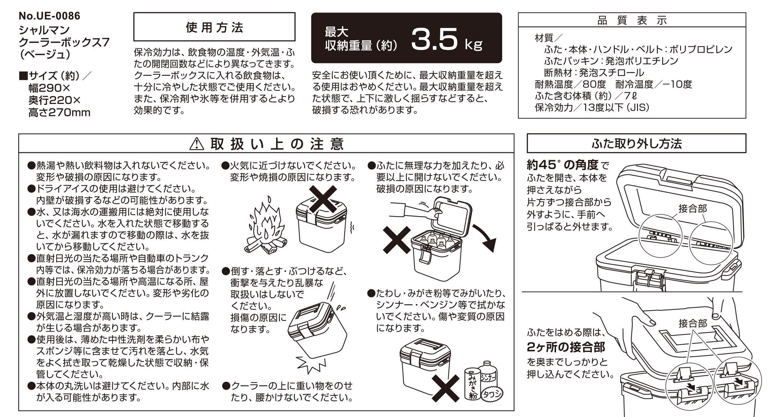 材質:ふた・本体・ハンドル・ベルト/ポリプロピレン、ふたパッキン/発泡ポリエチレン、断熱材/発泡スチロール、耐熱温度/80度、耐冷温度/-10度、原産国:日本