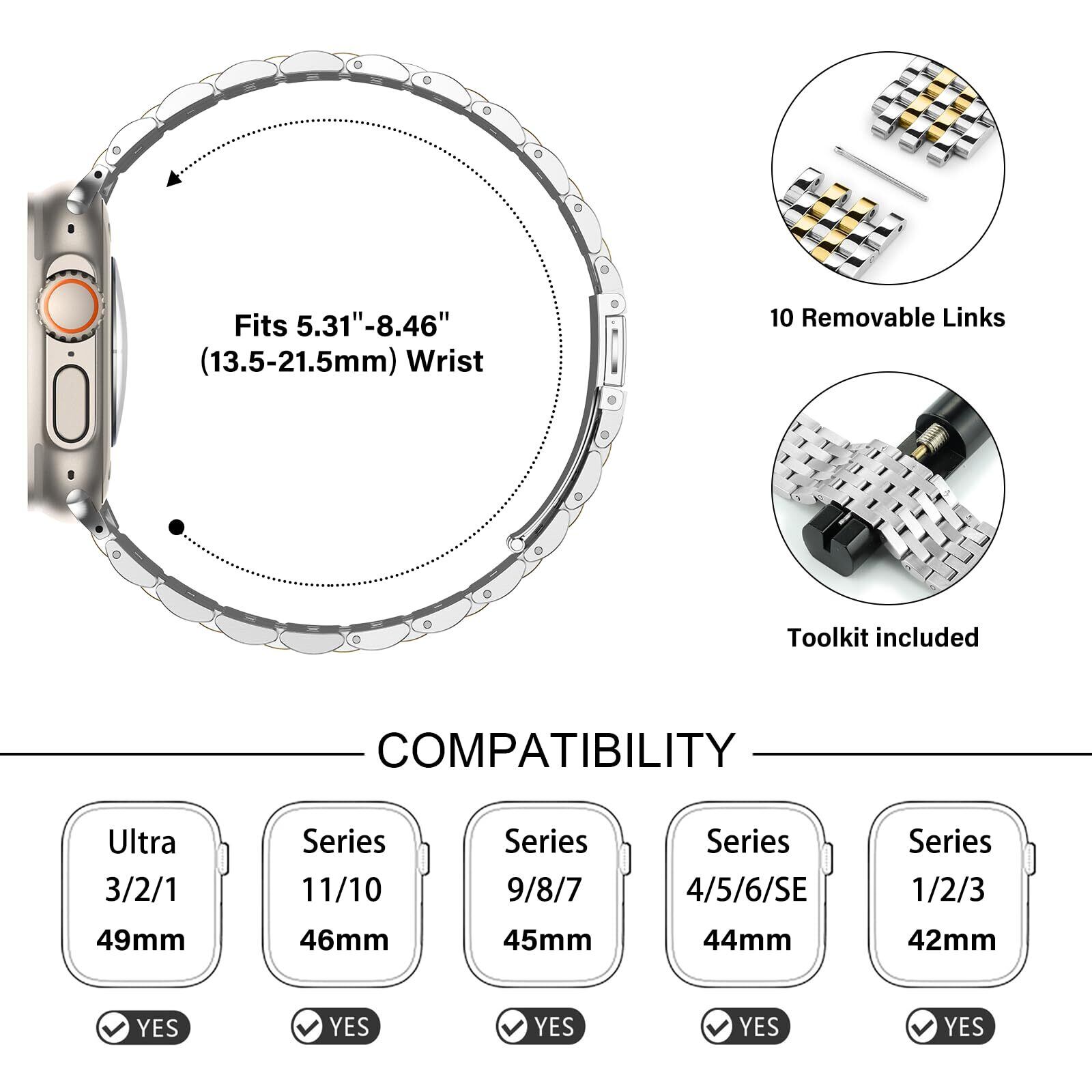 【簡単調整】 パッケージには取り外し工具と説明書が付属。ストラップは10個の着脱可能チェーン付きで細い手首にも対応(5.31〜8.46インチ/13.5-21.5mm)。ストラップの損傷を防ぐため、正しい手順でブレスレットを取り外してください。