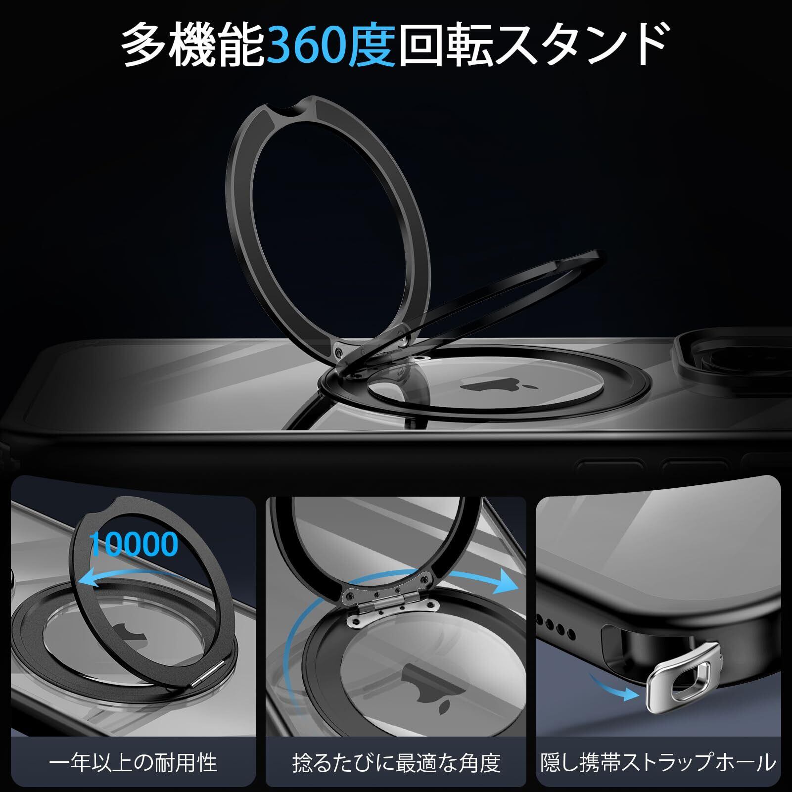 iPhone 15 用 ケース ダブルリング付き ショルダー ストラップ付き 多機能360度回転スタンド MagSafe対応 ワイヤレス充電対応 耐衝撃 アイフォン15 ケース 薄型 透明 PC + 軽量 シリコン TPUバンパー おしゃれ スマホケース (ブラック, iPhone 15)