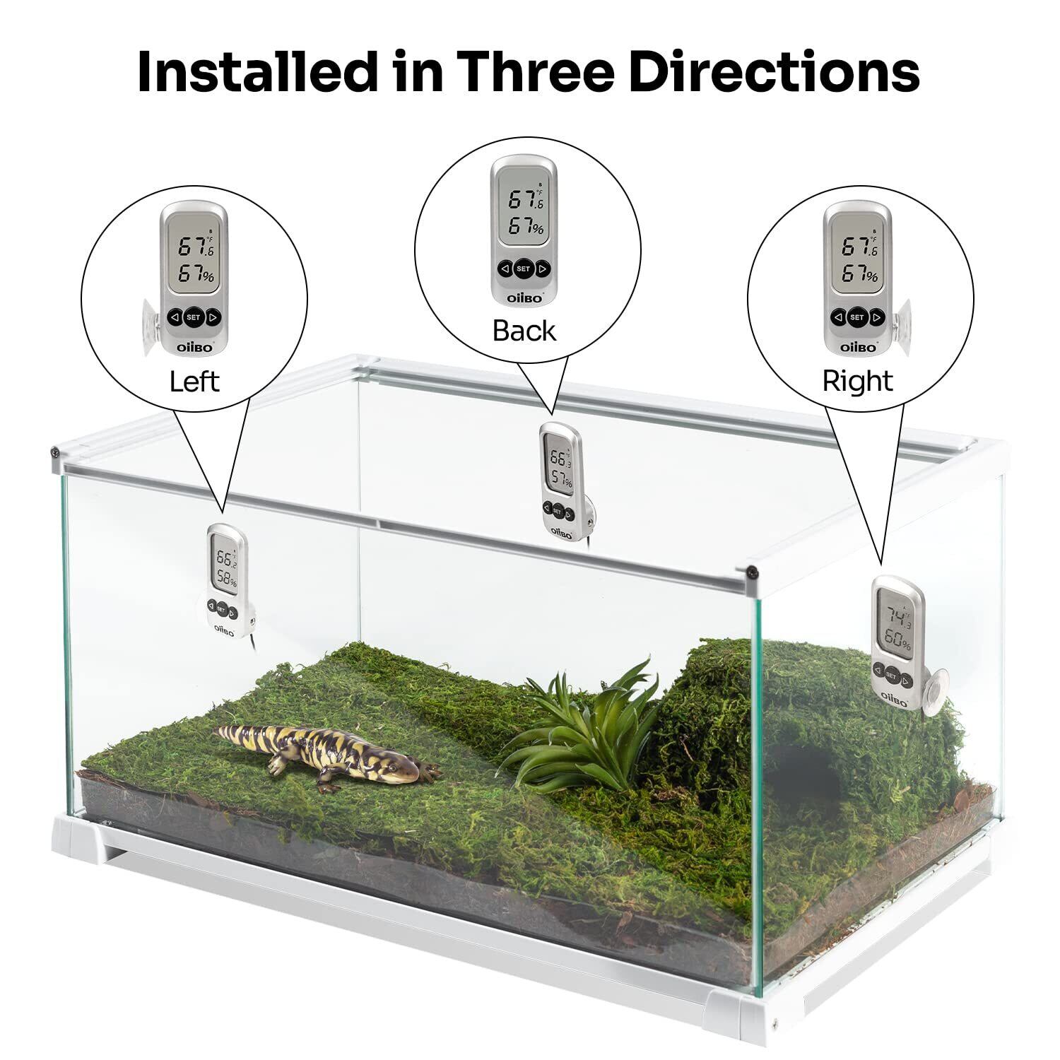 【3面設置】爬虫類飼育箱の左側、右側、または後部に吸盤で強固に取り付けやすい。電源駆動: LR1130ボタン電池 x1(付属)