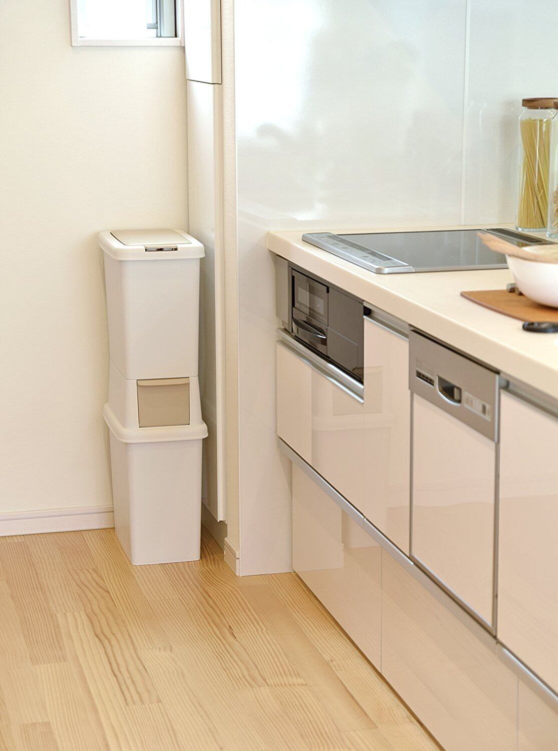 積み重ねて二分別できる省スペースダストボックス。上段はボタンを押してワンプッシュで開閉、下段は前開きタイプ。袋の装着がラクにできるポリ袋押さえ付き。安心安全の日本製。