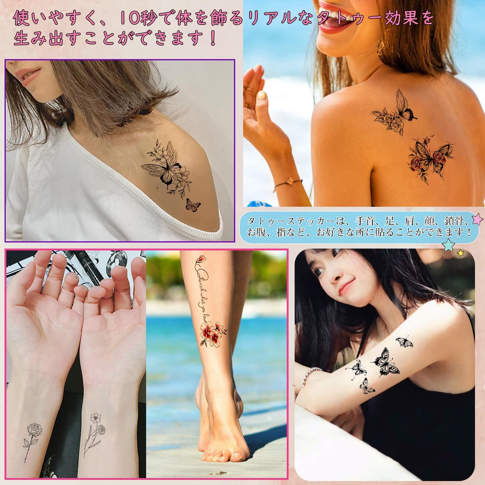 【用途多様】タトゥーステッカーは、手首、足、肩、顔、鎖骨、お腹、指など、好きな場所に貼れるだけでなく、お祭り、夏、誕生日、パーティーなど、様々なシーンで大活躍です