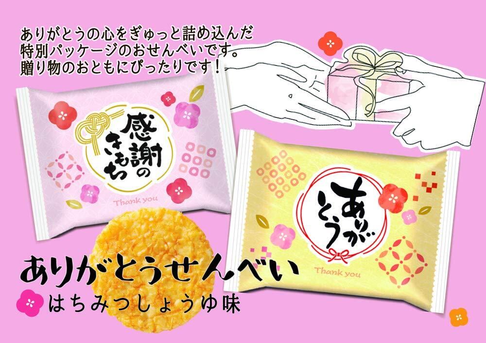 「ありがとうせんべい」は、ありがとうの心をぎゅっと詰め込んだ特別パッケージのおせんべいです。贈り物のおともにぴったりです!直接手渡しすることで言葉にせずとも「ありがとう」「感謝のきもち」の気持ちが伝わります。