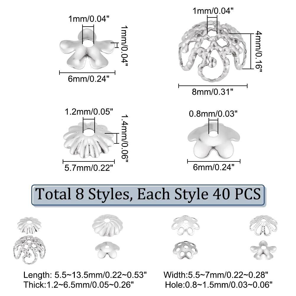PH PandaHall ビーズキャップ 花座 約320個 座金 304ステンレスースチール ビーズ 8種 カラフル 透かしキャップ スペーサービーズ フラワー 花状 アクセサリーパーツ ジュエリー用 ピアスパーツ 手芸用品 イヤリング ネックレス 手作り DIY飾り物 シルバー