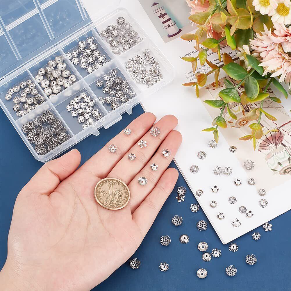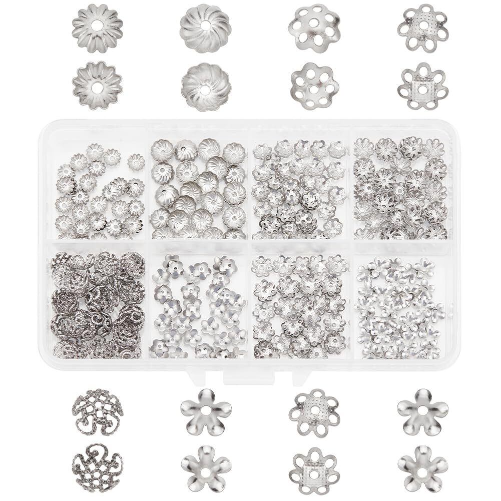 【在庫セール】PH PandaHall ビーズキャップ 花座 約320個 座金 304ステンレスースチール ビーズ 8種 カラフル 透かしキャップ スペーサービーズ フラワー 花状 アクセサリーパーツ ジュエリー用 ピアスパーツ 手芸用品 イヤリング ネックレス 手作り DIY飾り物 シルバー