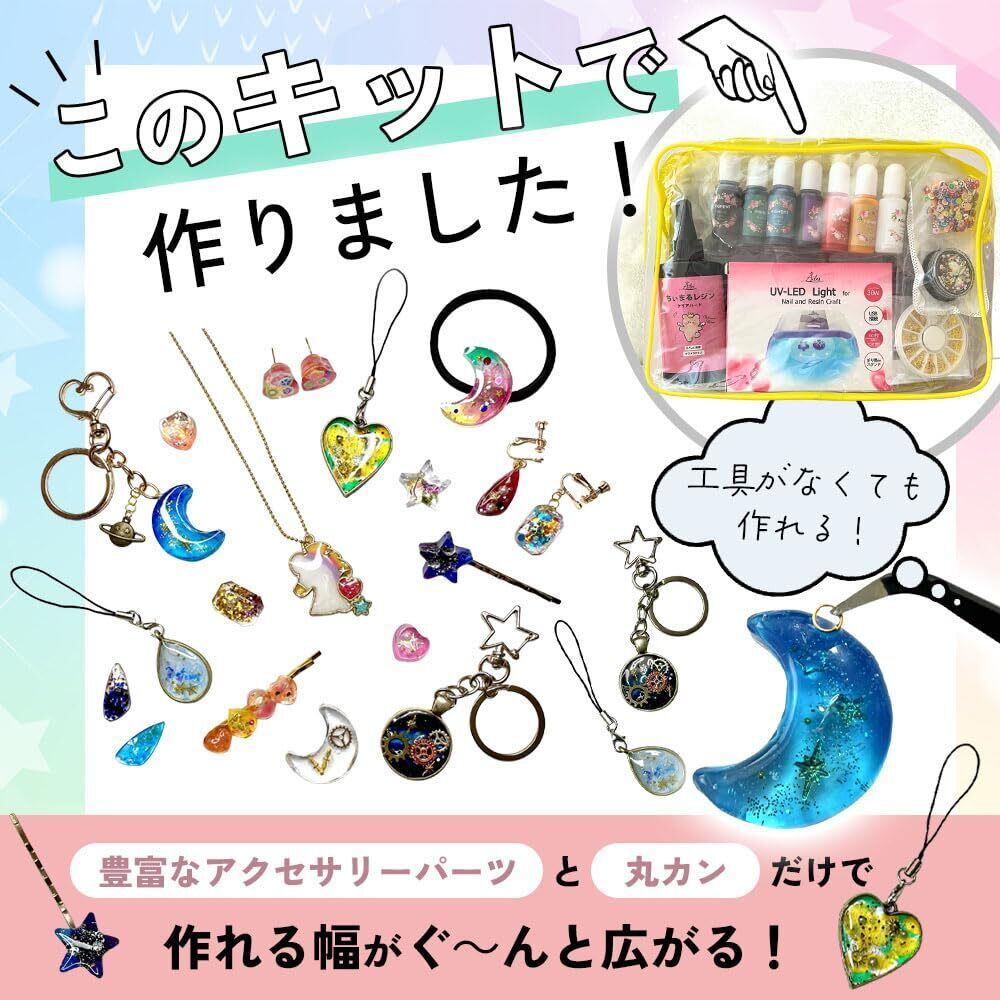 ??【セット内容】レジン液(ハードタイプ)65g、液体着色剤7色(レッド・パープル・ブルー・グリーン・イエロー・ブラック・ホワイト)、調色パレット、調色スティック、シリコンモールド3種、封入素材小瓶48個セット、ミックスキラキラパーツ1ケース、メタルパーツミックス1個、キーホルダー2種、カニカン付きストラップ4本、台座付きヘアピン2個、ピアス&キャッチ4個ずつ、イヤリングパーツ2個、ネックレスチェーン1本、スライスアソートパーツ1袋、ウッドスティック5本セット、ピンセット、ネイルファイル、両側機能付き筆1本、空枠&ミール皿全部で6種、歯車パーツ適量、UVライト、収納ポーチ