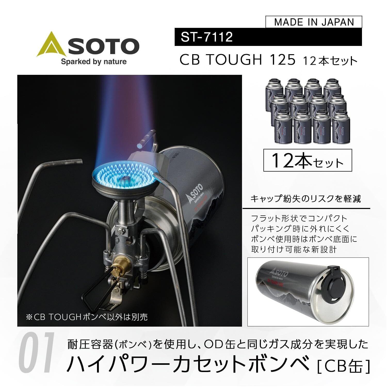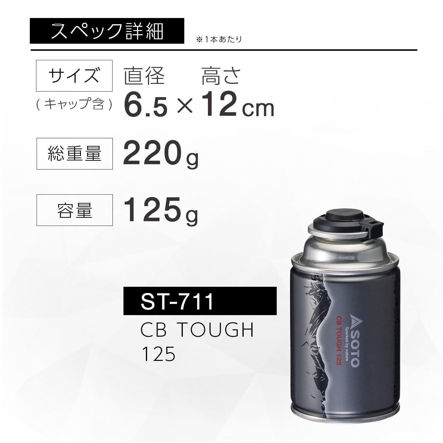 ●セット内容:CB TOUGH 125×12本(ST-711×12本)●原産国:日本●成分:液化プロパン、液化イソブタン、液化ノルマルブタン●サイズ:直径6.5×12cm(キャップ含)、重量:約220g ※1本あたり●容量:125g