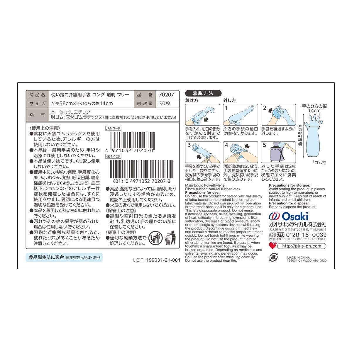 プラスハート 使い捨て介護用手袋 ロング 30枚入 フリーサイズ ゴム袖付 70207