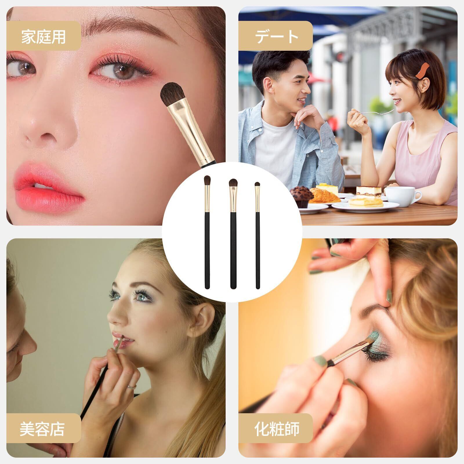 【商品仕様】:アイシャドーブラシは3本セット、S、M、Lの3サイズでメイクの使い分けに便利。ナチュラルメークからパーティーメイクまで、このワンセットでばっちり。
