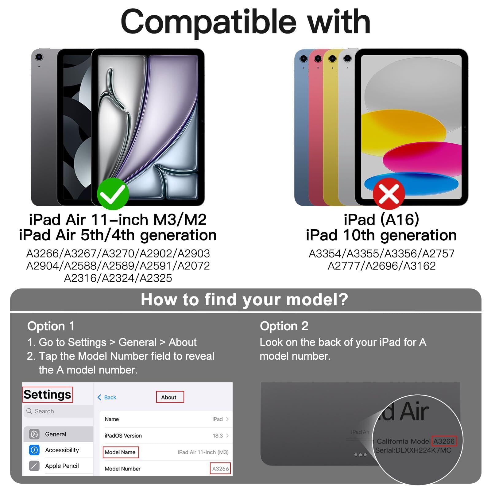 [互換性] ご注意: iPad (A16) ケース 第11/10世代 (2025/2022モデル)には対応できません。 Pencil Pro/Pencil(USB-C)に対応。iPad Air 11インチ M3/M2 (2025/2024) 、iPad Air 5/4(2022/2020、第5/4世代、10.9インチ)用の特別デザインです。対応モデル:A3266 / A3267 / A3270 / A2902 / A2903 / A2904 / A2588 / A2589 / A2591 / A2324 / A2072 / A2316 / A2325。「設定」>「一般」>「情報」の順に選択します、「モデル番号」フィールドをタップしてAモデル番号を表示します