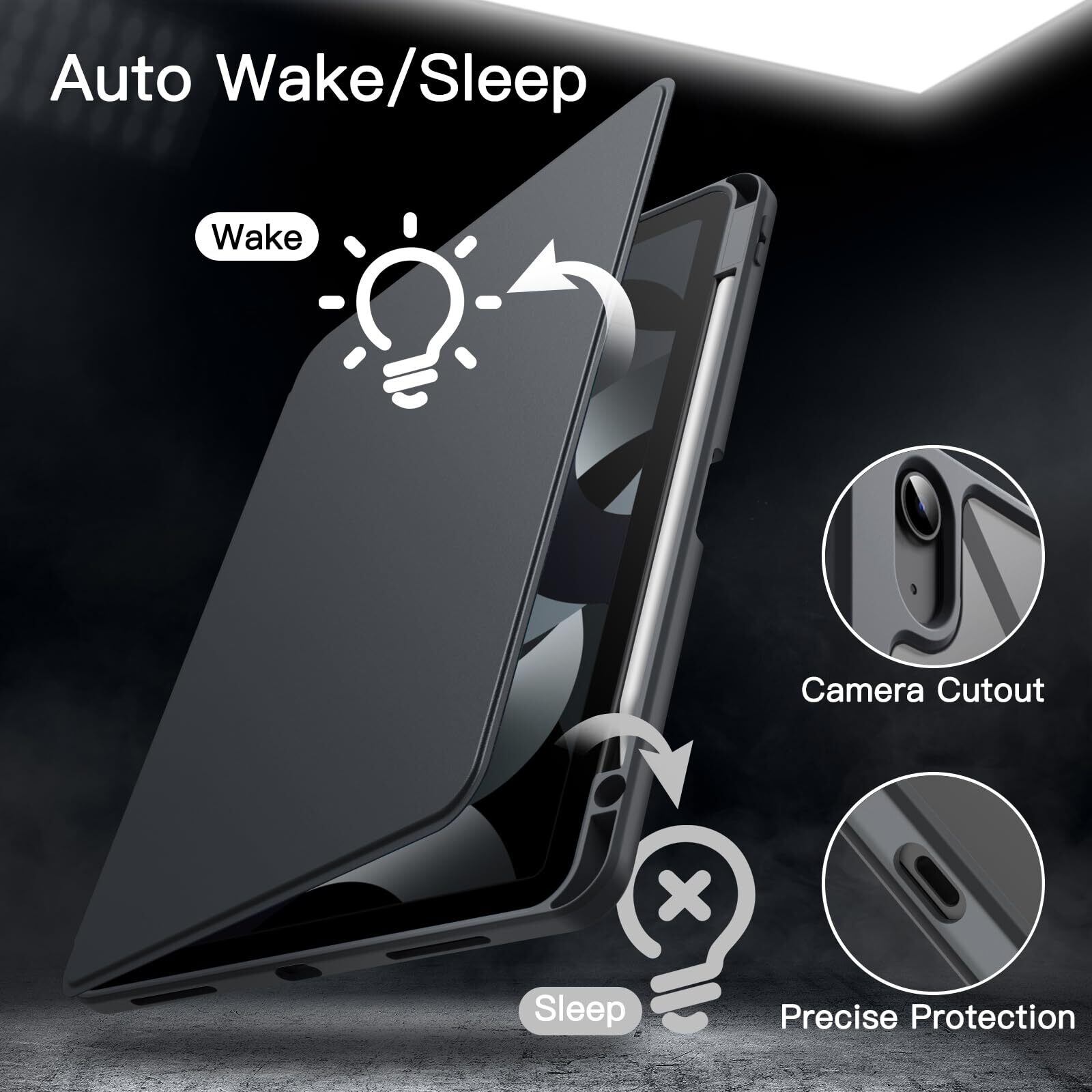 [自動ウェイクアップ/スリープ] フロントカバーの開閉により、画面を起動またはスリープモードにします。もっと省エネ、内蔵マグネットでケースをしっかり閉められます