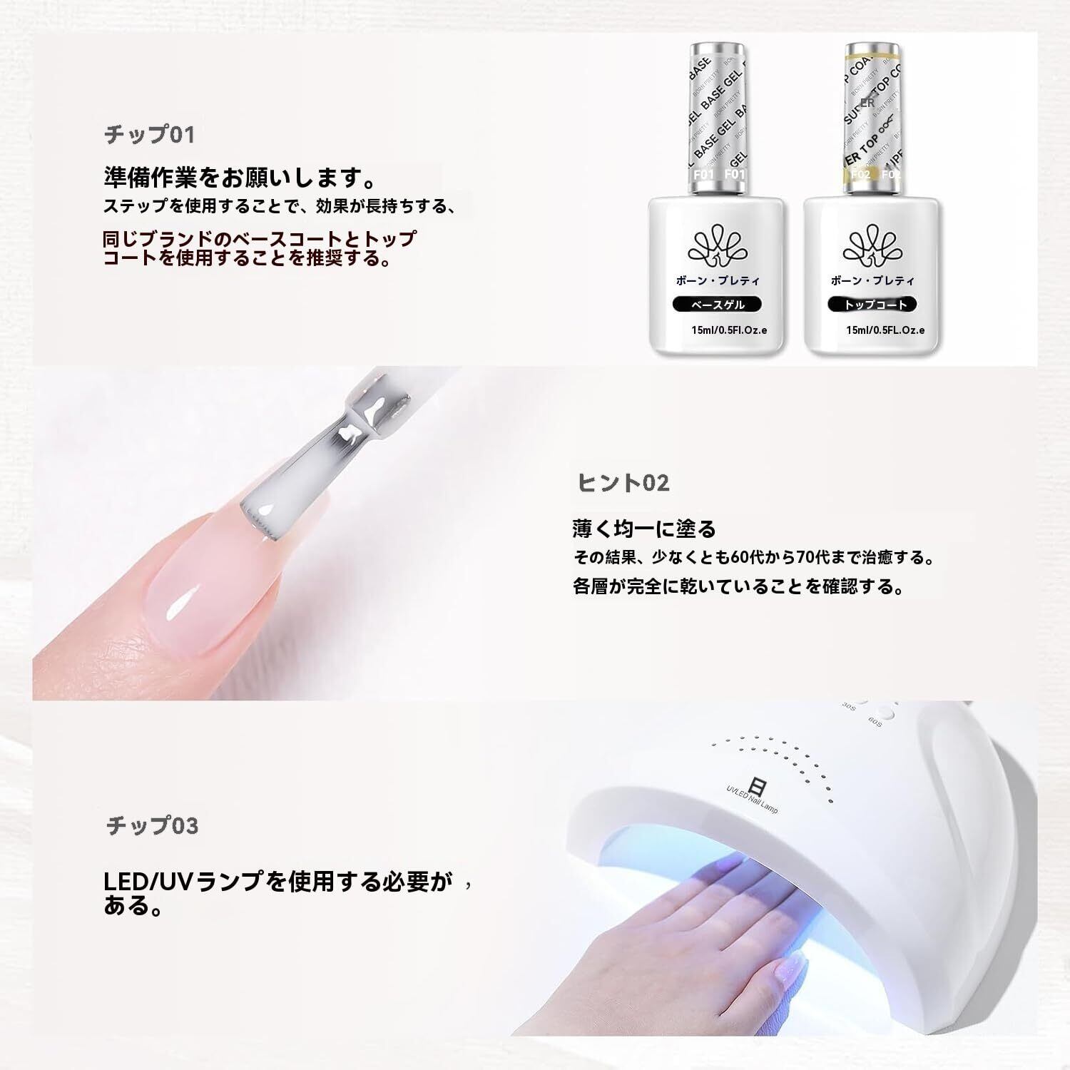 単色でもクリアネイルでどの季節でも◎ 重ね塗りやデザインにも使え、ジェルの扱いやすさもおすすめ! 絶妙な粘度で流れにくいから、初心者様にもおすすめです。