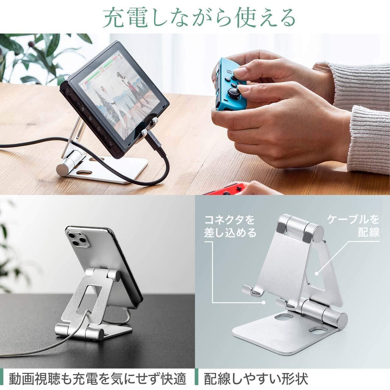 サンワダイレクト スマホスタンド 折りたたみ アルミ 無段階角度調整 iPhone Nintendo Switch 対応 シルバー 200-STN036