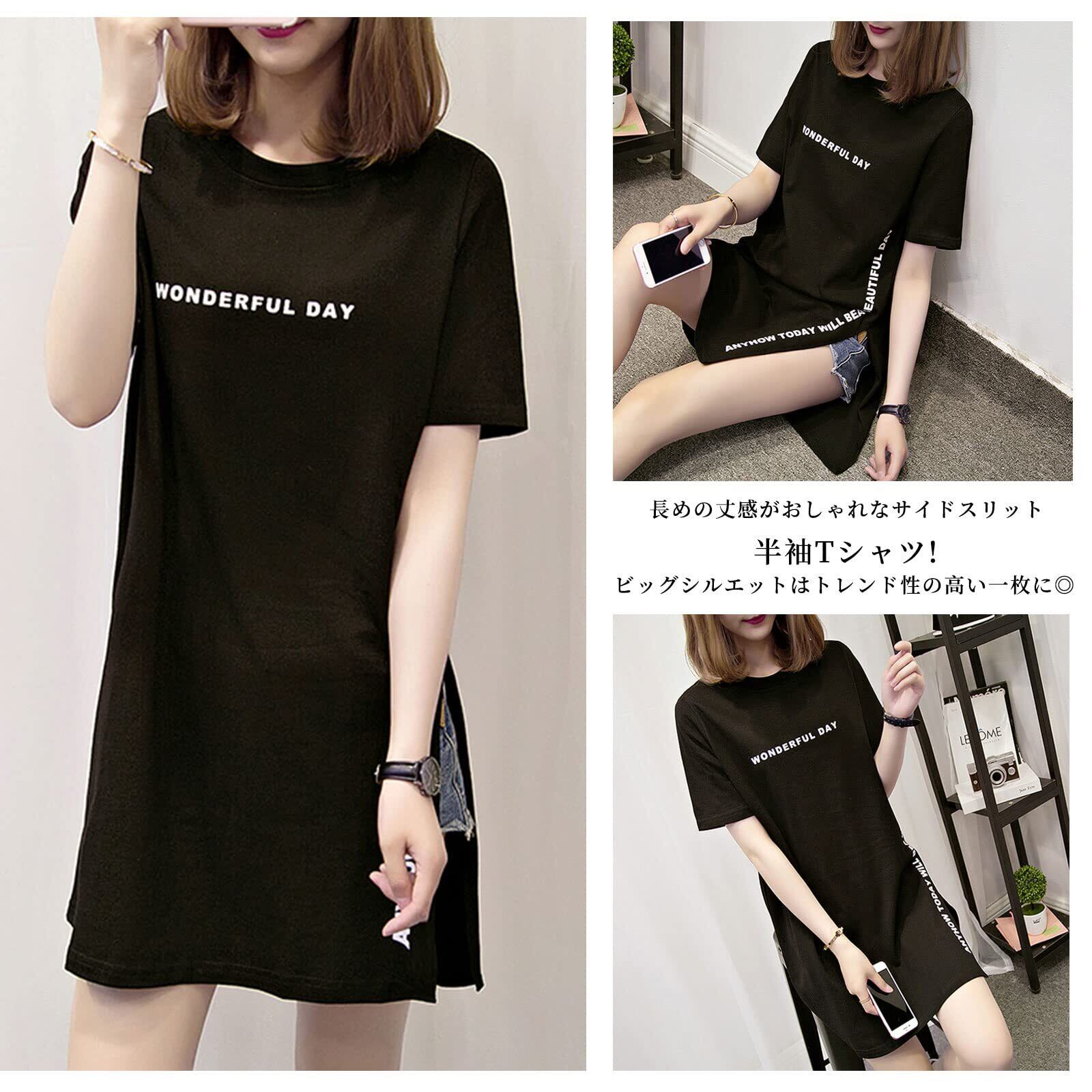 【新着商品】[7-livehouse] tシャツ レディース 半袖 ロング丈 大きいサイズ ゆったりトップス 夏 無地 カットソー ロゴTシャツ サイドスリット 通気性がいい ラウンドネック プリント 可愛い きれいめ 通勤 オフィス