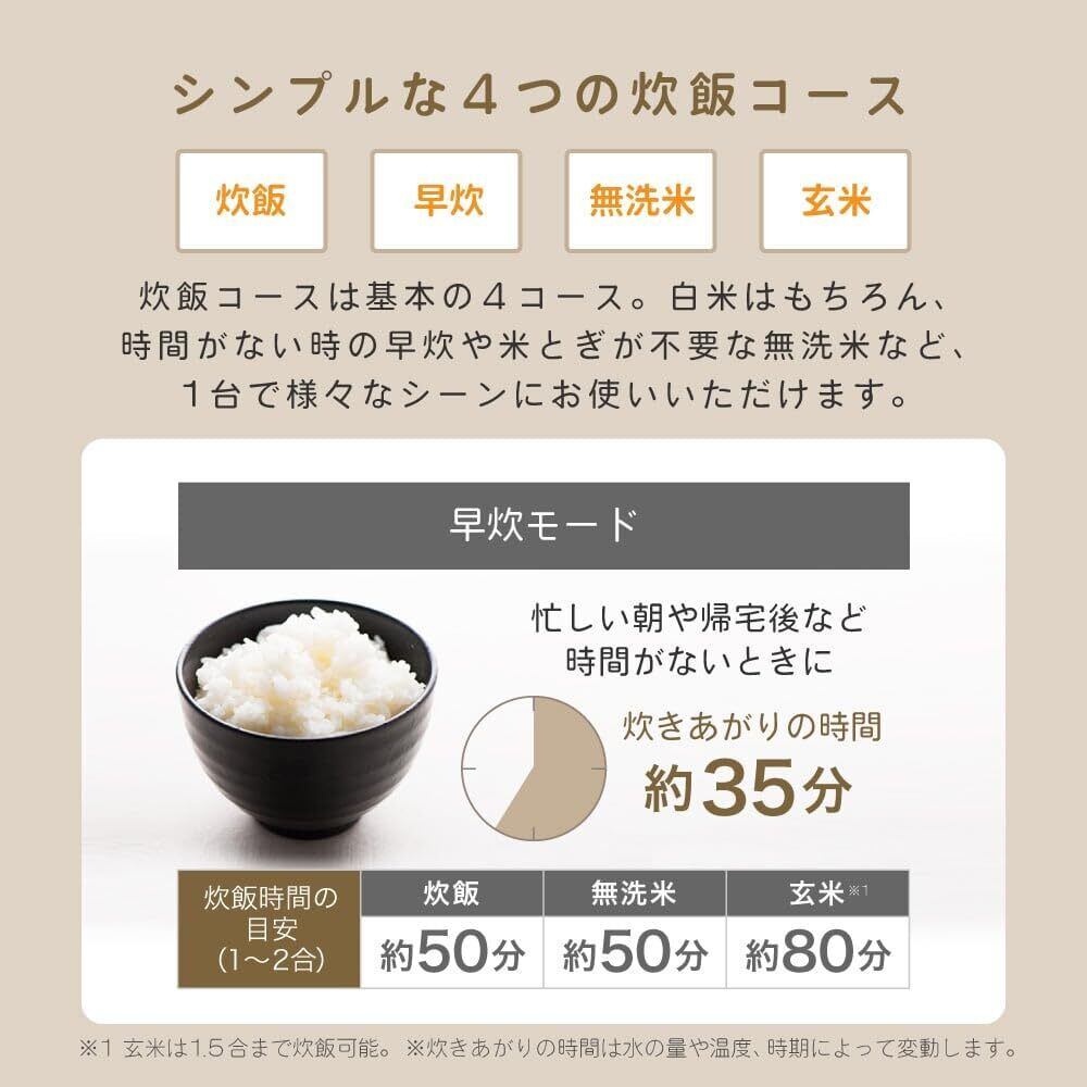 炊飯コースはベーシックな4つのコース搭載。 白米はもちろん、時間がない時に早炊きや米とぎ不要な無洗米など、1台で様々シーンにお使いいただけます。