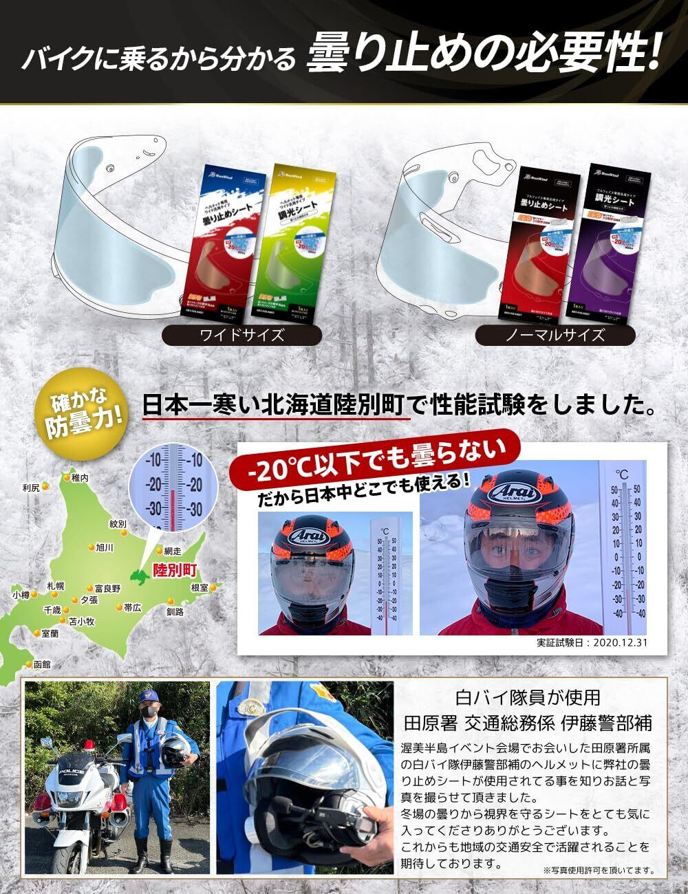 ?【極寒の地、北海道陸別町での実証試験】2021年12月31日朝7時頃、国内屈指の極寒地と言われる北海道陸別町で-23℃のなか、代表自ら実証試験を行い防曇性能の高さを実証いたしました。全ての曇り止めシート素材は、実証実験で使用した物を使用しております。