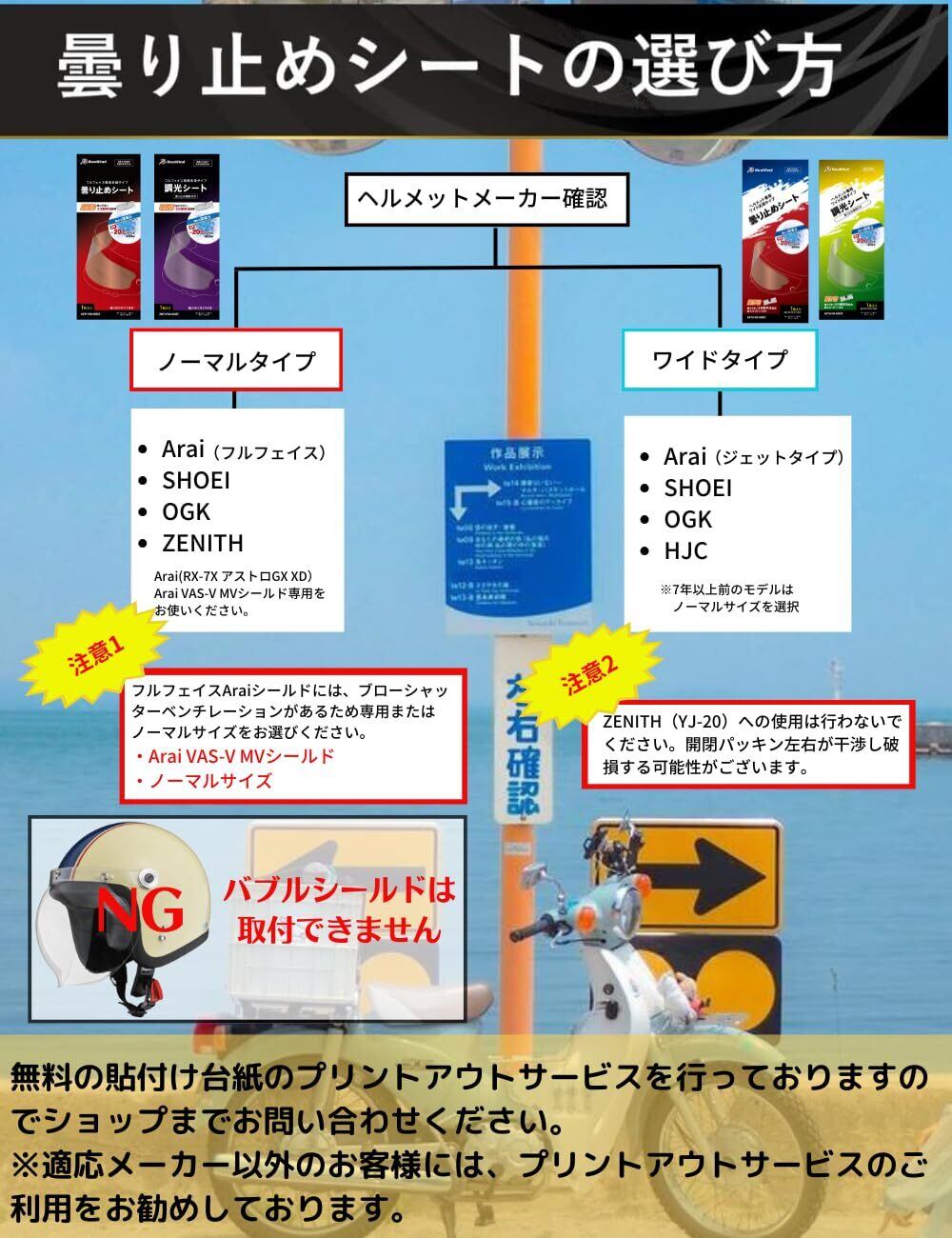 ?【確認サービス】ご希望のお客様には貼り付け台紙のデータを送らせていただきます。お手持ちの ヘルメットに貼り付け可能かどうかを確認することができるサービスとなりますのでぜひご利用ください。※貼付け台紙の位置を決めたらシールドをヘルメットに戻していただき、ご自身の走行姿勢をとって視界の確認をお願いいたします。ピンロックの有無で貼り付ける位置が異なりますので、紹介コンテンツの動画でご確認ください。