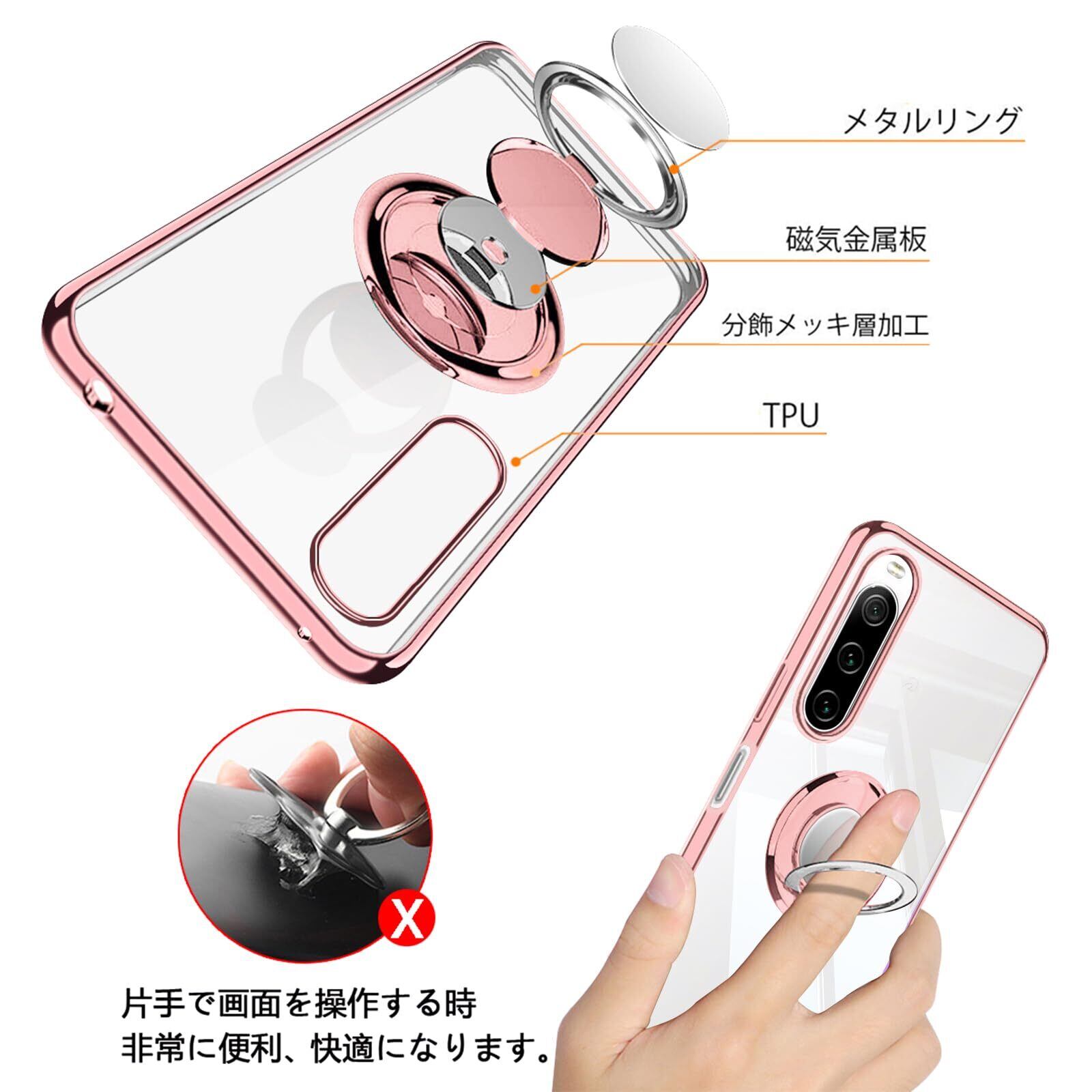 Xperia 10 II ケース リング クリア TPU 耐衝撃 透明 メッキ加工 SO-41A スマホケース SOV43 カバー スタンド機能 車載ホルダー 360°回転 ストラップホール付き Xperia 10II カバー ローズゴールド