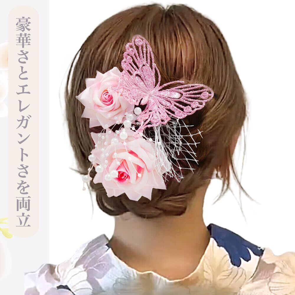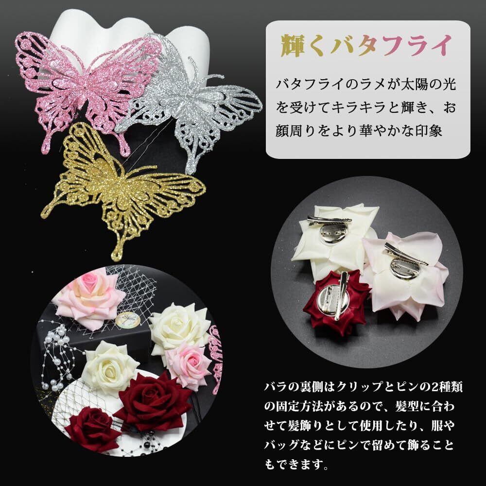 【ロマンティックなローズ&バタフライ】サイズ異なる2輪のバラと生き生きとした蝶の組み合わせが、まるで花の中の妖精のよう。網型の飾りと垂れ下げビーズが、見た目全体の豊かさをさらに高めます。お客様が満足できるように、ひとつひとつ丁寧に手作りでお作りしております。※商品に施されているラメは、摩擦や衝撃により剥がれる場合がございますが、製品の特性で不良品ではございません。