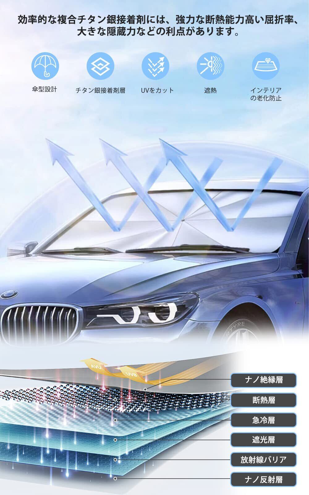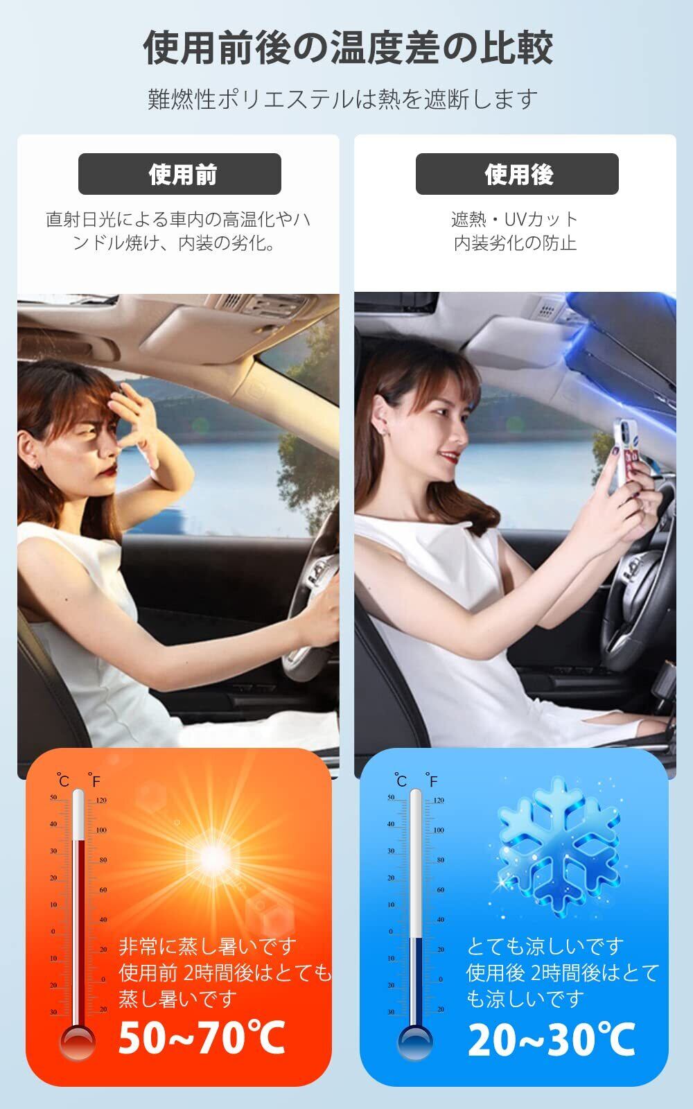3【猛暑対策99.5%以上UVカット・遮光断熱】夏には、紫外線を防ぎ、車内の温度を下げることを目指します。フロントサンシェードにより、紫外線に対するバリアを作ります。約98%以上の紫外線を効果的に遮断しますので、外気温が上昇しても、駐車中の車内を涼しく保ち、ひどい暑さを防げます。蒸し暑い車の環境に悩まされることはなくなります。 内装劣化防止、ダメージや経年劣化を防ぎます。駐車時の大事な車を太陽光による損傷やハンドル焼け、ダッシュボードなどの樹脂部分の日焼けからしっかりご愛車を守ります。駐車の度に気持ちをより涼しくしてくれます。