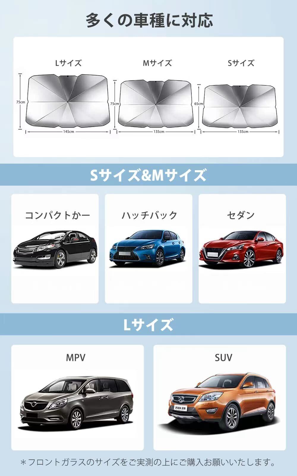 4【便利と多用途】サイズ: Sサイズ:125X65cm Mサイズ:135*75 Lサイズ:145X79cm 「Lサイズ」と「Mサイズ」「Sサイズ」の3製品をご用意。クルマ、トラック、SUV、バン、ミニバンなど、市場に出回っているほとんどのモデルに対応できる。収納サイズは約35cm*12cm*10cmだけで、傘のように持ち運びに便利です。ご購入前に車のサイズを測ってください。注意:1.手動測定による微妙なサイズ誤差を許容してください