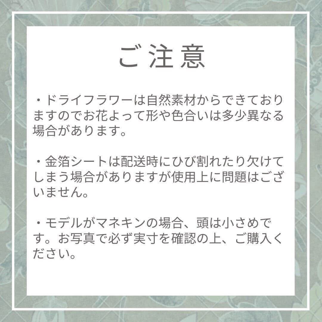 ※プリザーブドフラワー(ドライフラワー)は非常に繊細です。一度壊れてしまいますと元には戻りませんので、お取り扱いは優しくお願いいたします。※造花は何度でも繰り返しお使いいただけます。※モデルの頭は少し小さめです。ご購入前に個々のお花の大きさを必ずご確認お願いいたします。 ※お手持ちのモニターによりお色味が実際の商品と異なって見える場合がございます。※プリザーブドフラワー(ドライフラワー)は本物のお花から作られておりますので、個々のサイズやお色味が若干異なる場合がございます。