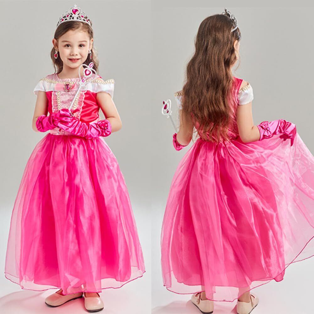 ★【オーロラ姫 ドレス登場】明るく色鮮やかなシンプルなデザインのピンクのドレス。胸元のラインストーンが華やかな 眠れる森の美女 の オーロラ姫 風デザインのドレス。 スカートはふんわりボリュームがあります。純綿の裏地など多層生地が構成され、ふわふわと見え、お肌に弱いお嬢さんにも適用します。