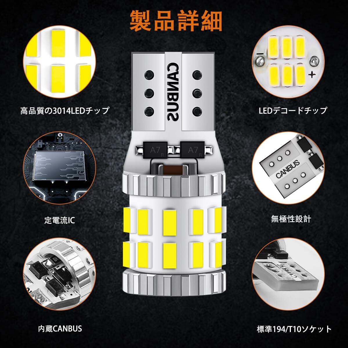 【導電性&耐久性抜群】CANBUS T10ソケットは全面的に導電でき、市販品の導電鉄線より、精度が高。インテリジェント IC ドライバーと航空アルミニウムを内蔵し、パフォーマンスが向上し、入力電流保護回路が安定し、安全な温度範囲と一定の明るさが確保され、瞬間の熱伝導と短時間の排熱ができて、効率の高い放熱も可能になります、LED 電球の寿命が最大 50,000 時間になります。