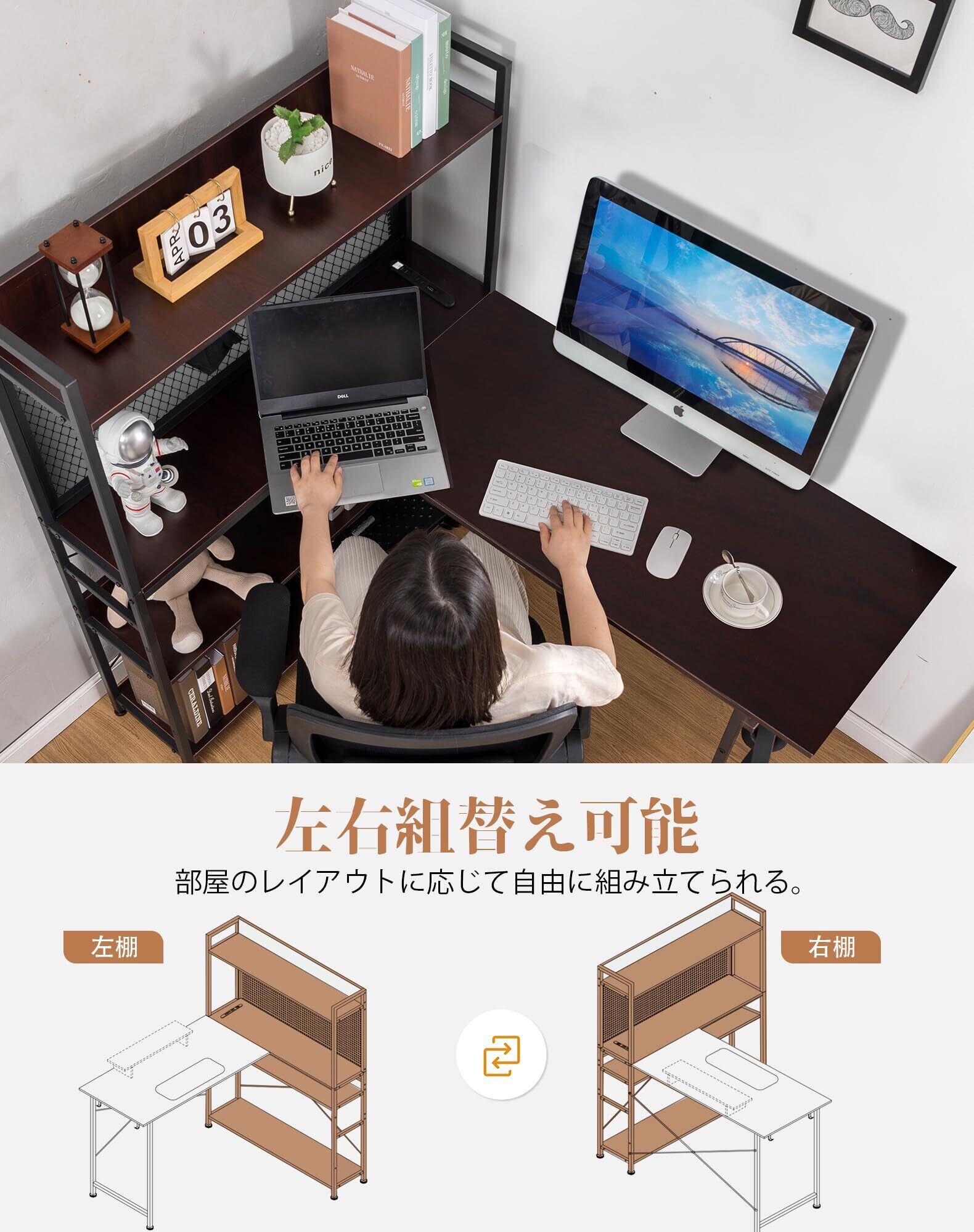 【多機能デザイン】このl型デスクは、多くの便利な機能が備わっています。多層の収納書棚(調節可能な棚板)や壁面に便利な収納パンチングボード、マルチ電源タップなど、さまざまなニーズに対応します。モニターアーム取り付けにも対応しています。お部屋のレイアウトに合わせて自由に左右組み換え可能。 LEDテープライトも付いて、色で雰囲気を変えましょう。機能性と品質の両方を兼ね備え、効率的な作業環境を提供します。