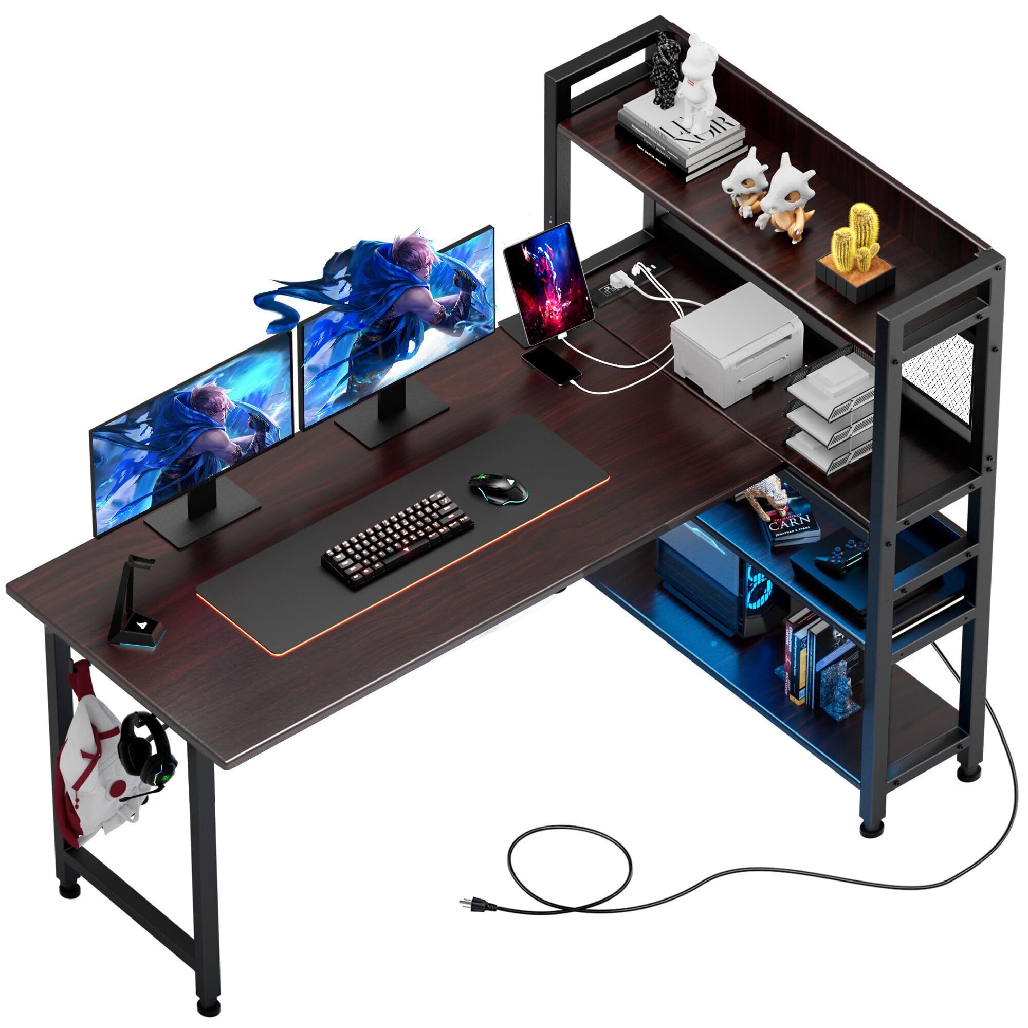 COMHOMA ゲーミングデスク パソコンデスク l字 コンセント/棚/led付き モニターアーム対応 棚板高さ調節可能 多層収納 壁面収納 パンチングボード 頑丈なフレーム 左右組み換え自由 フック/ラック付き エコな板材採用 省スペース CD47-BT-1-brown pcデスク l字デスク 作業机 l字型パソコンデスク