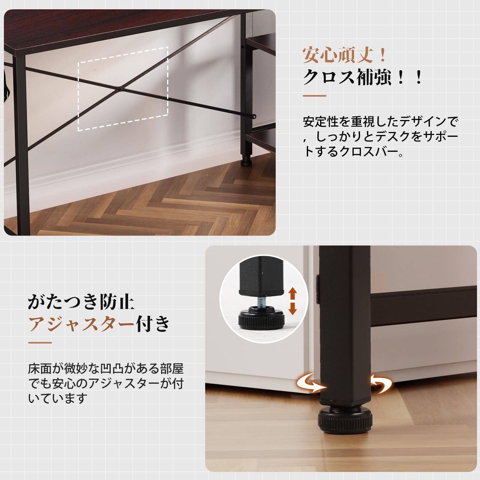 【たっぷり載せられる頑丈設計】ゲーミングデスクの総耐荷重は100KG で、パソコンや周辺機器などをたっぷり載せられます。天板はフレームでがっちり補強されており、安定感を重視しています。天板裏の補強パイプ・クロスバーなど、ガタつきを防ぐ工夫を各部に施しています。 脚先のアジャスター・強度の高く耐久性に優れたスチールで、ガタつきのないしっかりした使用感を実現しました。