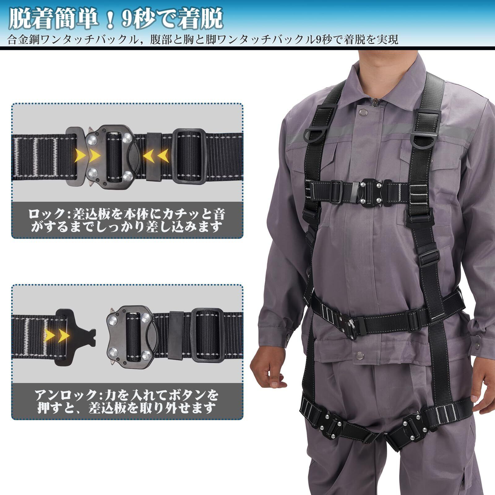 フルハーネス安全帯使用ヒント: 各部のサイズは調整できる、脱着カンタン。ショックアブソーバーはついていますので、一旦落下時墜落時、フルハーネスは衝撃を体全体に分散し。これにより、身体損傷を大幅に軽減できます