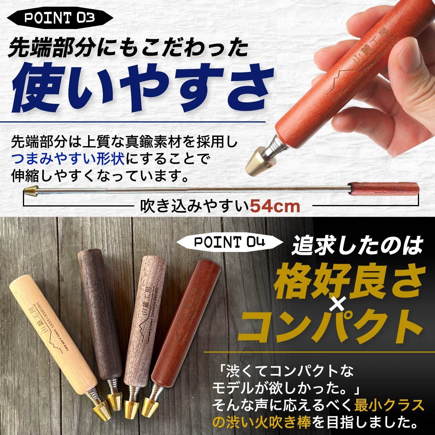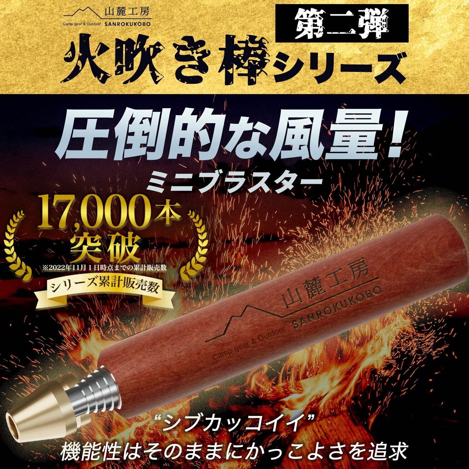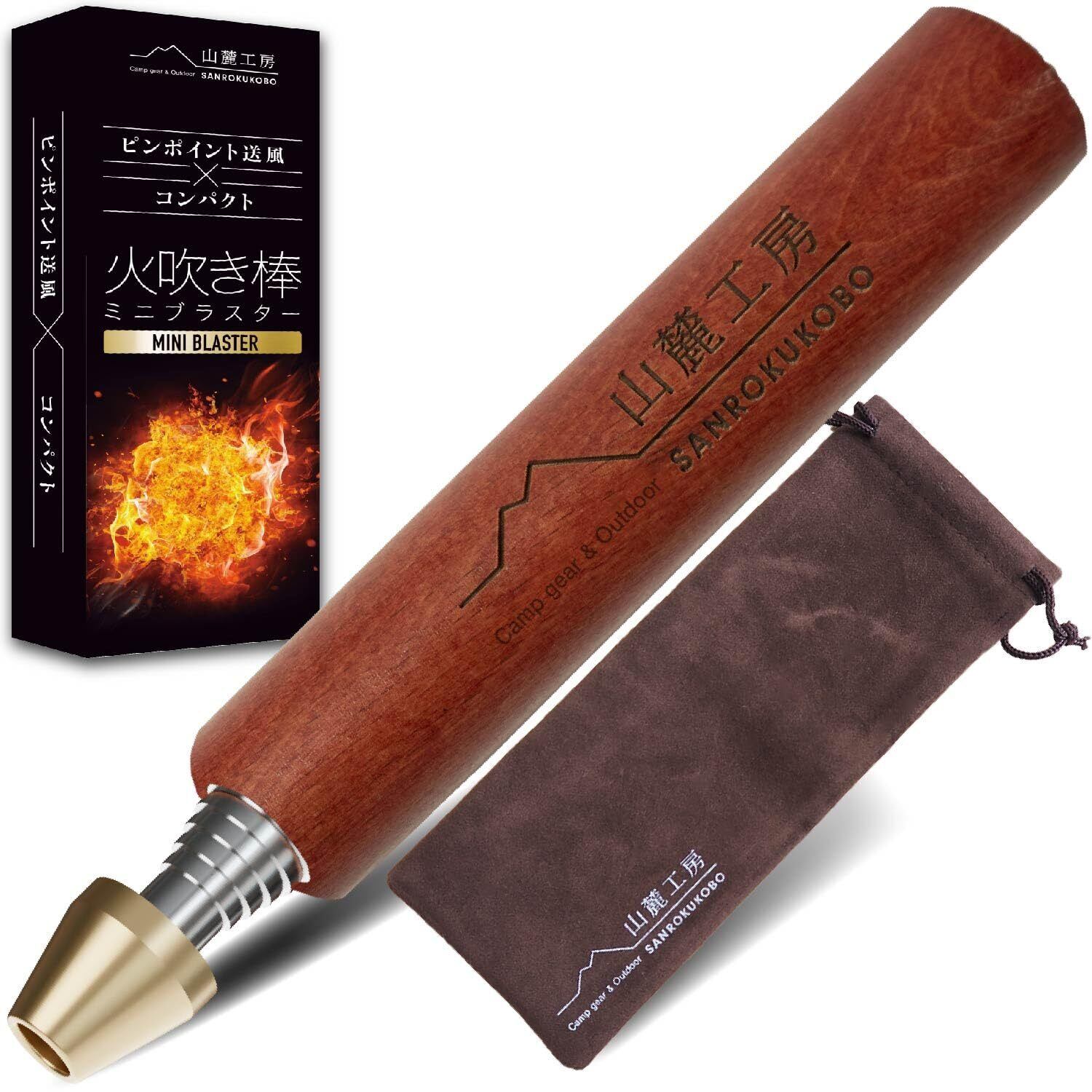 ?【山麓工房火吹き棒シリーズ第二弾!】山麓工房の大人気商品火吹き棒の第二弾、キャンプやバーベキューの際に役に立つ火吹き棒です。その名もミニブラスター。焚火の火が弱まってしまったとき、ピンポイントに酸素を送り込むことによってうちわなどとは違って灰が飛び散らず、火を何度も燃焼させることができます。「渋さ」「コンパクトさ」「吹きやすさ」にこだわりました。