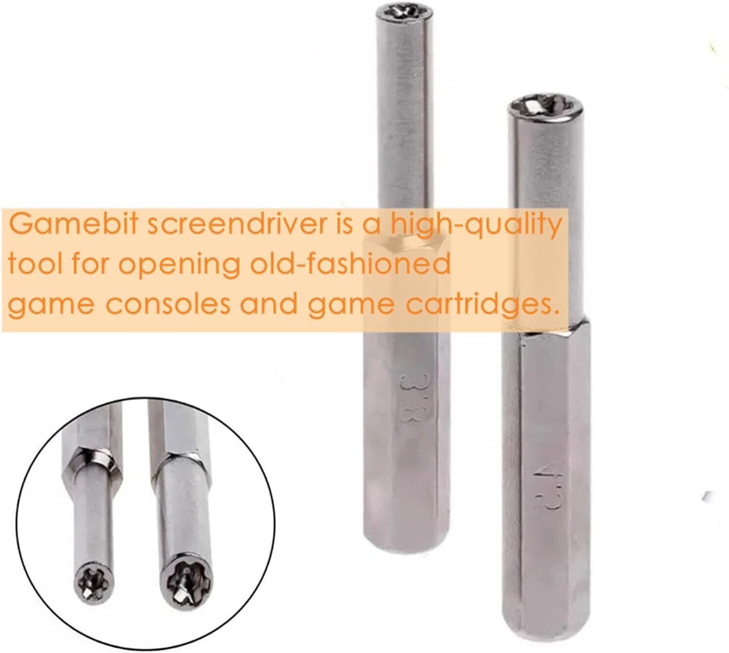【幅広適用】3.8mmビットは、NES、SNES、N64、バーチャルボーイ、ゲームボーイ、ゲームボーイカラー、ゲームギアのゲームカートリッジを開けるのに最適です。 4.5mm ビットは、Genesis、Master System、32X のゲーム カートリッジに加え、N64、Game Cube、Virtual Boy、Game Gear、TurboGrafx 16、および TurboDuo のシステムを開くことができます。 2.5mm ビットは、Wii、NDS、NDSL、DS Lite、GCN、GBA、GameBoy Advance用のトライウィングドライバー。