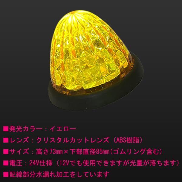 16個のLEDをクリスタルカットレンズが 効果的に拡散し美しく輝きます。 従来の球タイプに比べ高輝度なLEDは、長寿命、低消費電力、、デザイン性と機能性を両立しました。 ■発光カラー:ホワイト/アンバー/レッド/ブルー/グリーン ■レンズ:クリスタルドカットレンズ(ABS樹脂) ■サイズ:高さ73mm×下部直径85mm(ゴムリング含む) ■電圧:24V仕様(12Vでも使用できますが光量が落ちます) ■配線部分水漏れ防止加工をしています。 ※レンズの色はカラーレンズとなっております。(ホワイトのみクリアレンズとなっております。)商品ページの画像をご確認ください。 ※配線部の防水コーティングにより、耐久性及び防水性の向上は期待できますが、 完全防水ではございませんので、必要に応じ防水処理を施してください。