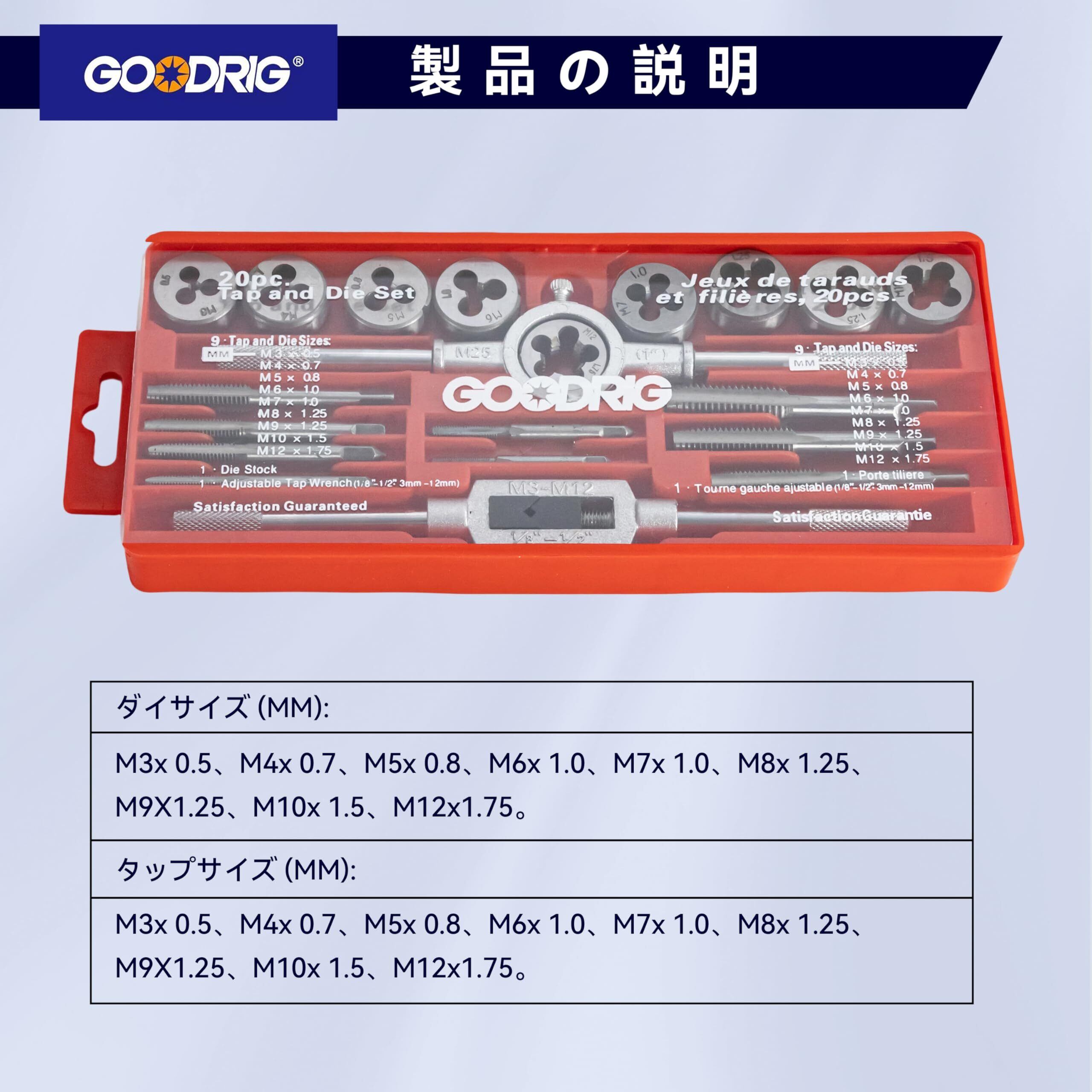 【20個セット】:ダイサイズ:M3x 0.5、M4x 0.7、M5x 0.8、M6x 1.0、M7x 1.0、M8x 1.25、M9X1.25M、10x 1.5、M12x1.75MM。タップサイズ:M3x 0.5、M4x 0.7、M5x 0.8、M6x 1.0、M7x 1.0、M8x 1.25、M9X1.25M、M10x 1.5、M12x1.75MM。 【材質】:高級タングステン合金鋼で製作され、刃先はシャープで滑らか、バリがなく、スムーズに切りくずを取り除くことができます。 【適用】:ネジ山の修復に適しています。切削はシャープで、タッピングは省力化されています。 【耐久】:タップホルダーレンチ(M3-M12)* 1個+ダイホルダーレンチ(25mm)* 1個、耐久性が持って、強いねじれがあり、持ちやすいです。 【収納便利】:収納ケースには保管用の特別なスロットがあります。取り出と持ち運びに便利です。